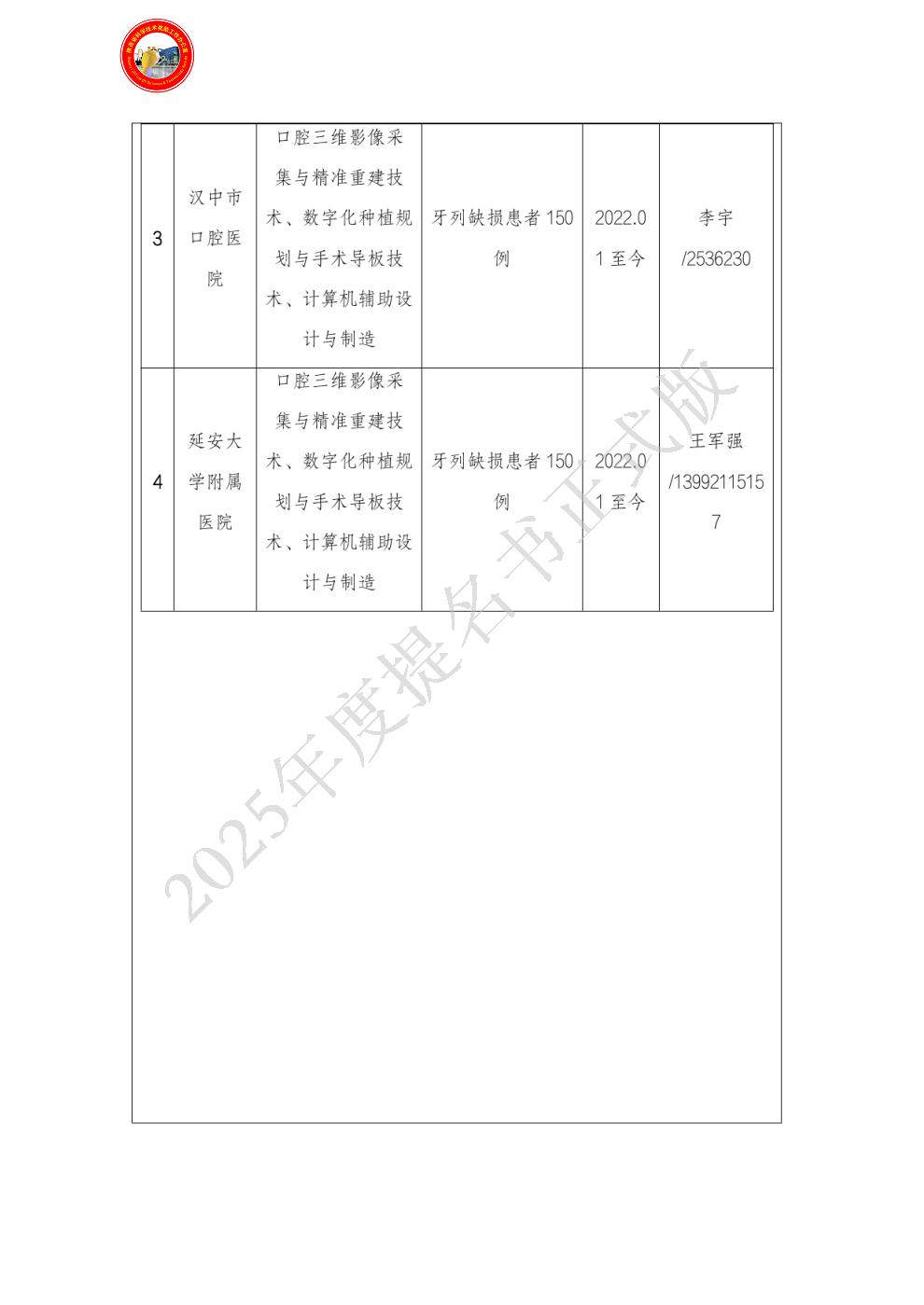 单位贡献:西安交通大学口腔医院(口腔医学院)是西安交通大学直属三所附属医院之一,是国家卫生健康委直属的集医疗、教学、科研、预防保健为一体的三级甲等口腔专科医院,其数字化种植修复科是集临床、教学、科研为一体的综合性临床科室。医院相当重视本项目,制定有完善的舒适化发展规划,各种扶持本项目开展的政策、措施齐全,尤其是通过西交口腔【2021】79号文件《西安交通大学口腔医院全系统内开放数字化种植诊疗平台的建设方案》,使开展数字化种植修复相关硬件水平达到国内一流水平。