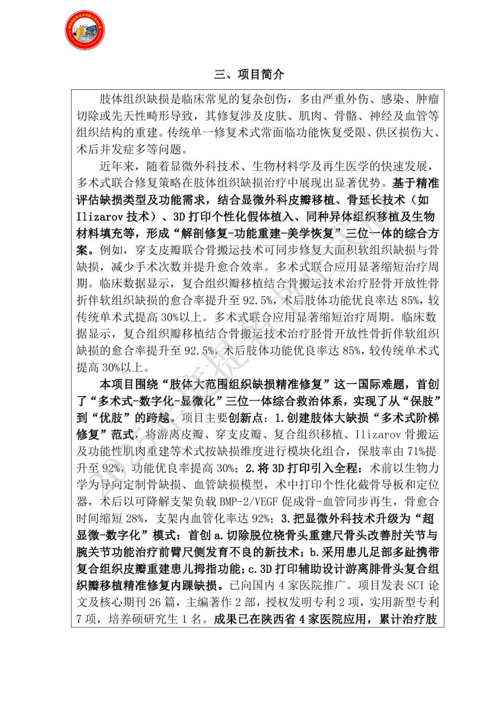 | 提名单位意见: | 本项目围绕“肢体大范围组织缺损精准修复”这一国际难题,首创了“多术式-数字化-显微化”三位一体综合救治体系,实现了从“保肢”到“优肢”的跨越。项目主要创新点:1.创建肢体大缺损“多术式阶梯修复”范式,将游离皮瓣、穿支皮瓣、复合组织移植、Ilizarov 骨搬运及功能性肌肉重建等术式按缺损维度进行模块化组合,保肢率由71 %提升至96 %,功能优良率提高32 %;2.将3D打印引入全程:术前以生物力学为导向定制骨缺损、血管缺损模型,术中打印个性化截骨导板和定位器,术后以可降解支架负载BMP-2/VEGF促成骨-血管同步再生,骨愈合时间缩短28 %,支架内血管化率达92 %;3.把显微外科技术升级为“超显微-数字化”模式:首创1)切除脱位桡骨头重建尺骨头改善肘关节与腕关节功能治疗前臂尺侧发育不良的新技术;2)采用患儿足部多趾携带复合组织皮瓣重建患儿拇指功能;3)3D 打印辅助设计游离腓骨头复合组织瓣移植精准修复内踝缺损。已向国内4家医院推广。项目发表SCI论文及核心期刊26篇,主编著作2部,授权发明专利2项,实用新型专利7项,培养硕研究生1名。成果已在陕西省4家医院应用,累计治疗肢体复杂缺损患者500余例,显著降低了截肢率与致残率,社会经济效益巨大。整体技术处于国内领先水平,特提名2025年度省(部)级科技进步奖二等奖。 |