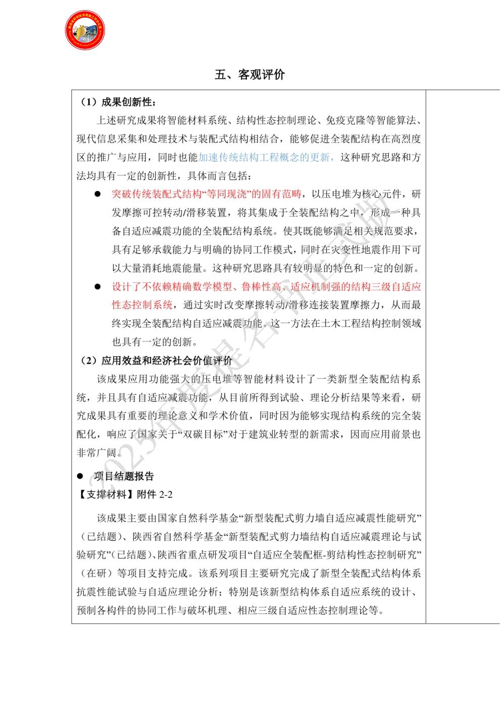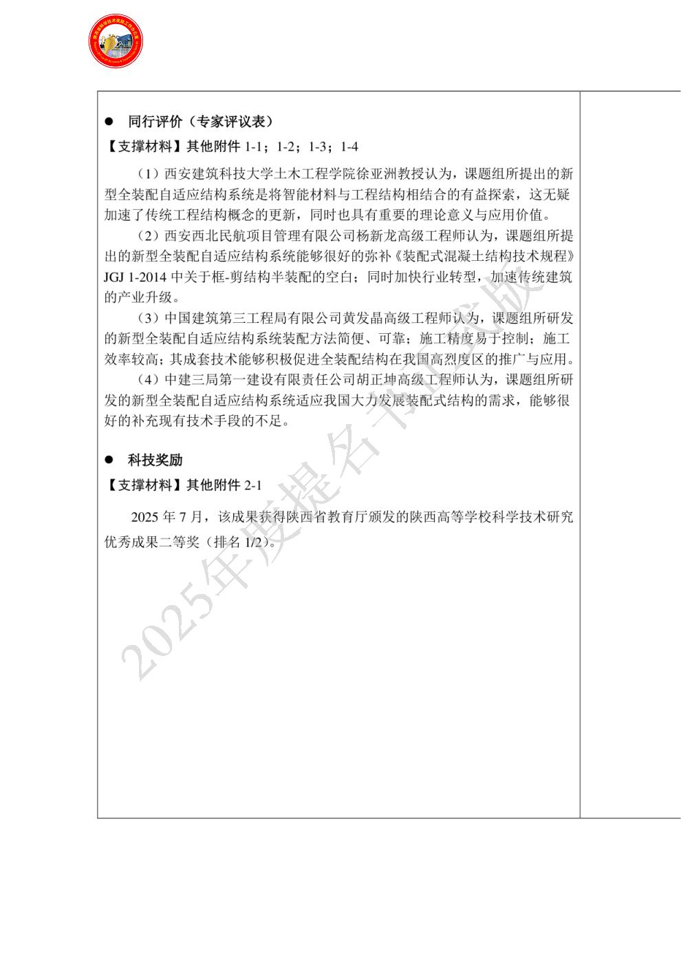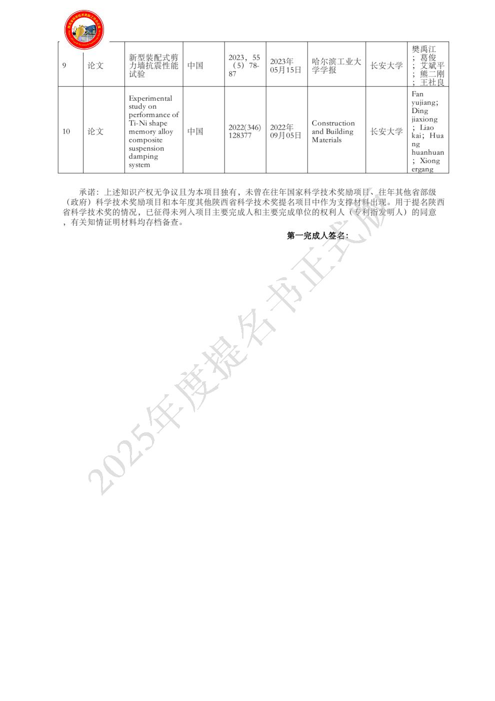 排名:2 行政职务:无 技术职称:教授 工作单位:长安大学 对本项目技术创造性贡献:为该成果主要完成人,在项目实施过程之中,协助研发了新型全装配结构系统,重点针对新型全装配结构系统有限元仿真和现场试验做出了大量工作。因而对创新点(1)、(2)、(3)均有重贡献。具体完成内容如下:1、作为发明人协助研发了系列新型全装配结构系统(框架/剪力墙/框架-剪力墙)(附件1、3)2、作为发明人协助研发了一种具有可恢复功能的梁柱节点位移放大减震装置3、发表相关学术论文10余篇。 曾获国家科技奖励情况:2025年7月,陕西高等学校科学技术研究优秀成果二等奖,“新型全装配结构系统自适应减震技术集成与应用”,排名第二