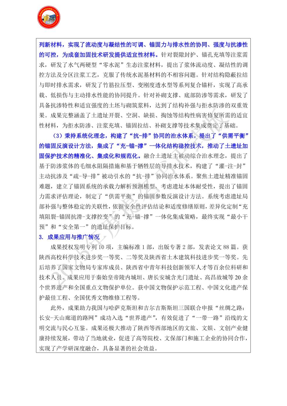 成果授权发明专利10项,主编标准1部,出版专著2部,发表论文88篇;获陕西高校科技进步奖一等奖、二等奖及陕西省土木建筑科技进步奖一等奖。应用于秦始皇帝陵内城垣、高昌故城等20余个世界遗产和全国重点文物保护单位,获中国文物保护示范工程、全国优秀文物维修工程等。经鉴定,成果整体达到国际先进水平,“充-锚-撑”一体化加固技术达到国际领先水平。