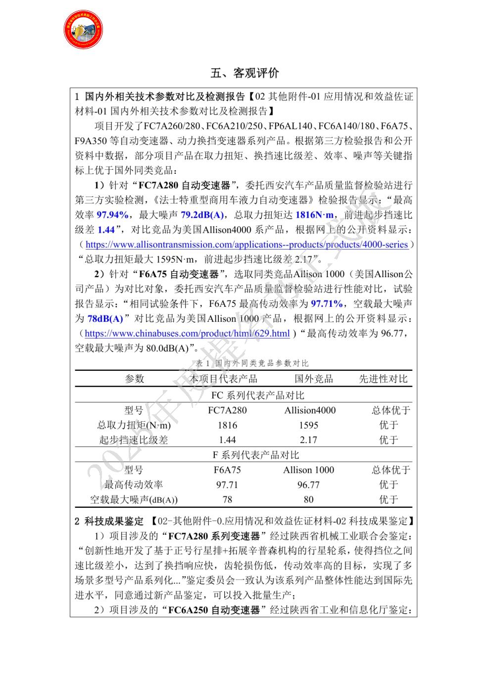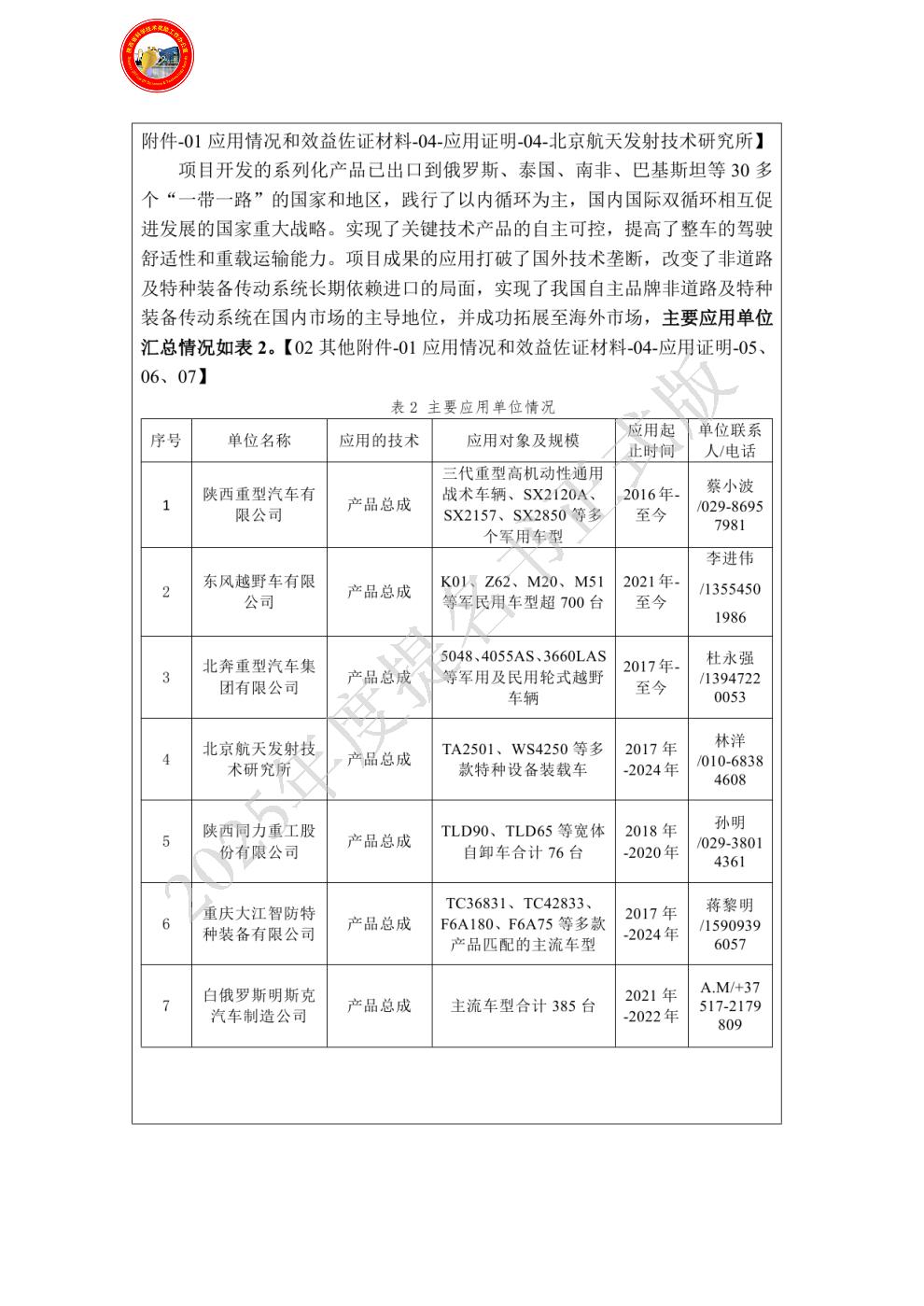 单位贡献:陕西法士特齿轮有限责任公司作为项目第二完成单位。主要完成创新技术1、创新技术2、创新技术3的样机试制、零部件投产、供应商开发等工作,同时承担非道路及特种装备智能传动系统的试验与验证工作,具体承担了传动系统总成的疲劳耐久、性能测试、可靠性测试,完成路况数据采集及载荷谱重构、整车匹配标定试验等工作,实现传动系统的智能控制机自适应标定技术,完成产品系列化生产和推广。