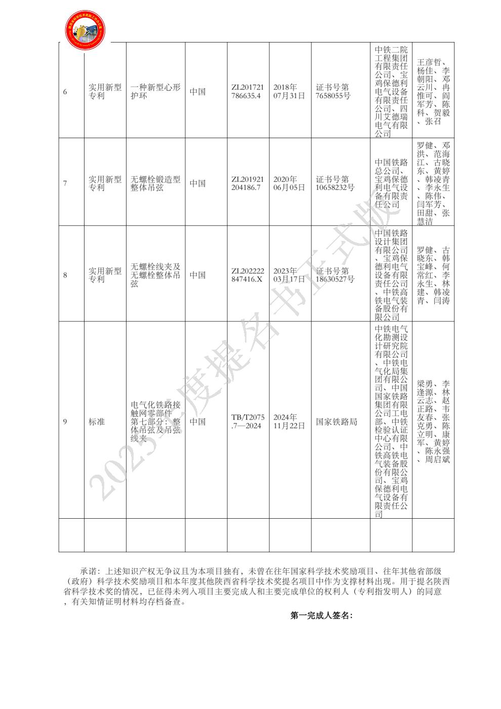| 提名单位意见: | 我单位认真审阅了该项目申报书及附件材料,确认全部材料真实有效,相关栏目均符合陕西省科学技术进步奖的填写要求。该项目属于高速电气化铁路接触网技术领域,海项目具有以下3项创新点:(1)提出了整体吊弦寿命评估方法,配套研制了机械疲劳试验平台。(2)新型耐疲劳吊弦采用凸圆形压接管方式,增大了压接面积,减少了压接损伤,吊弦本体采用抗疲劳绞线,优化了心形环结构,改善了吊弦抗疲劳及耐磨损性能。(3)研制了配套的压力可控的压接机具,保证压接质量可靠。