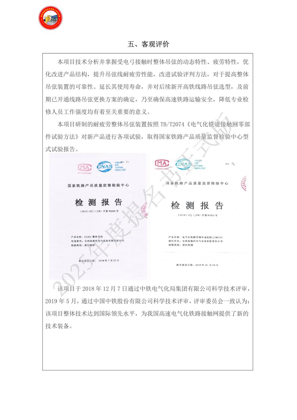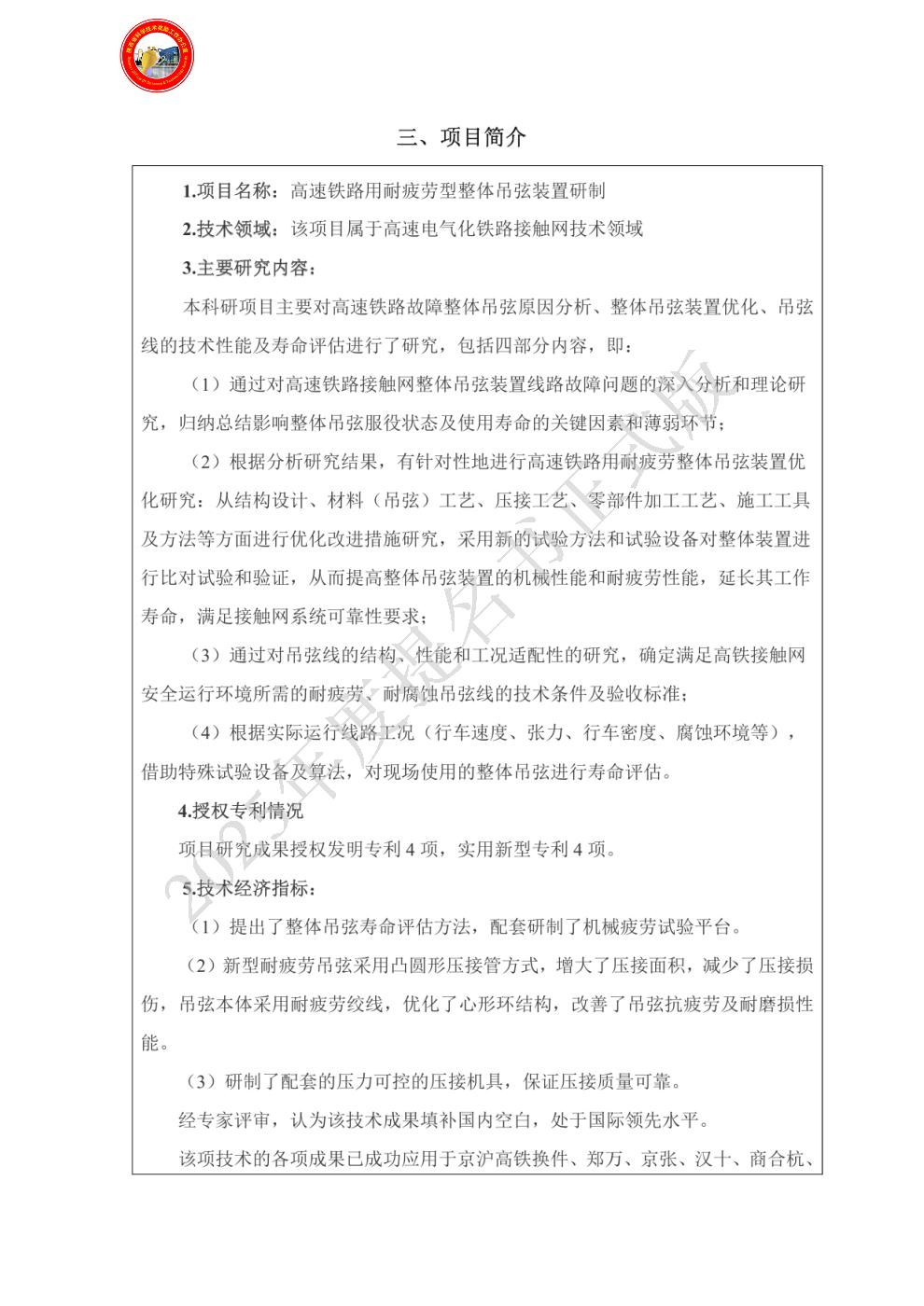 单位贡献: 中国铁路设计集团有限公司是本项目研究与开发工作的第三完成单位,完成了项目主要产品“耐疲劳吊弦”的设计开发及后期的推广应用。