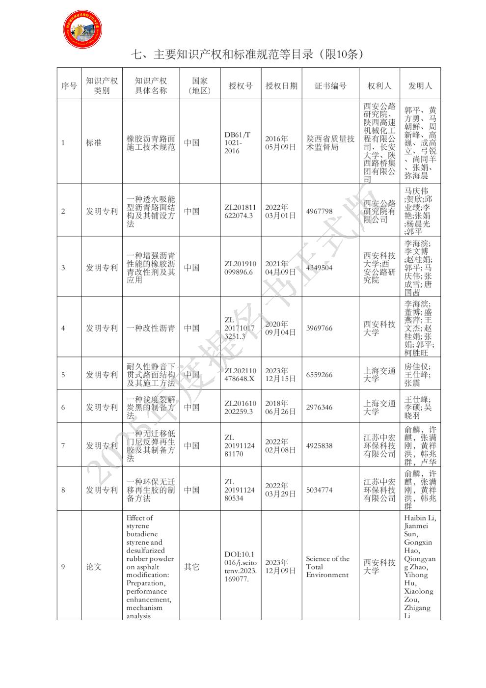 | 提名单位意见: | 该项目紧密服务国家“双碳”战略和交通强国建设目标,针对我国废旧轮胎资源化利用的重大需求,突破了橡胶沥青烟气大、性能波动大和施工和易性差等技术瓶颈,延长沥青路面服役寿命;为陕西省“节能环保”产业链高质发展提供关键技术支撑,助力交通运输绿色低碳转型。