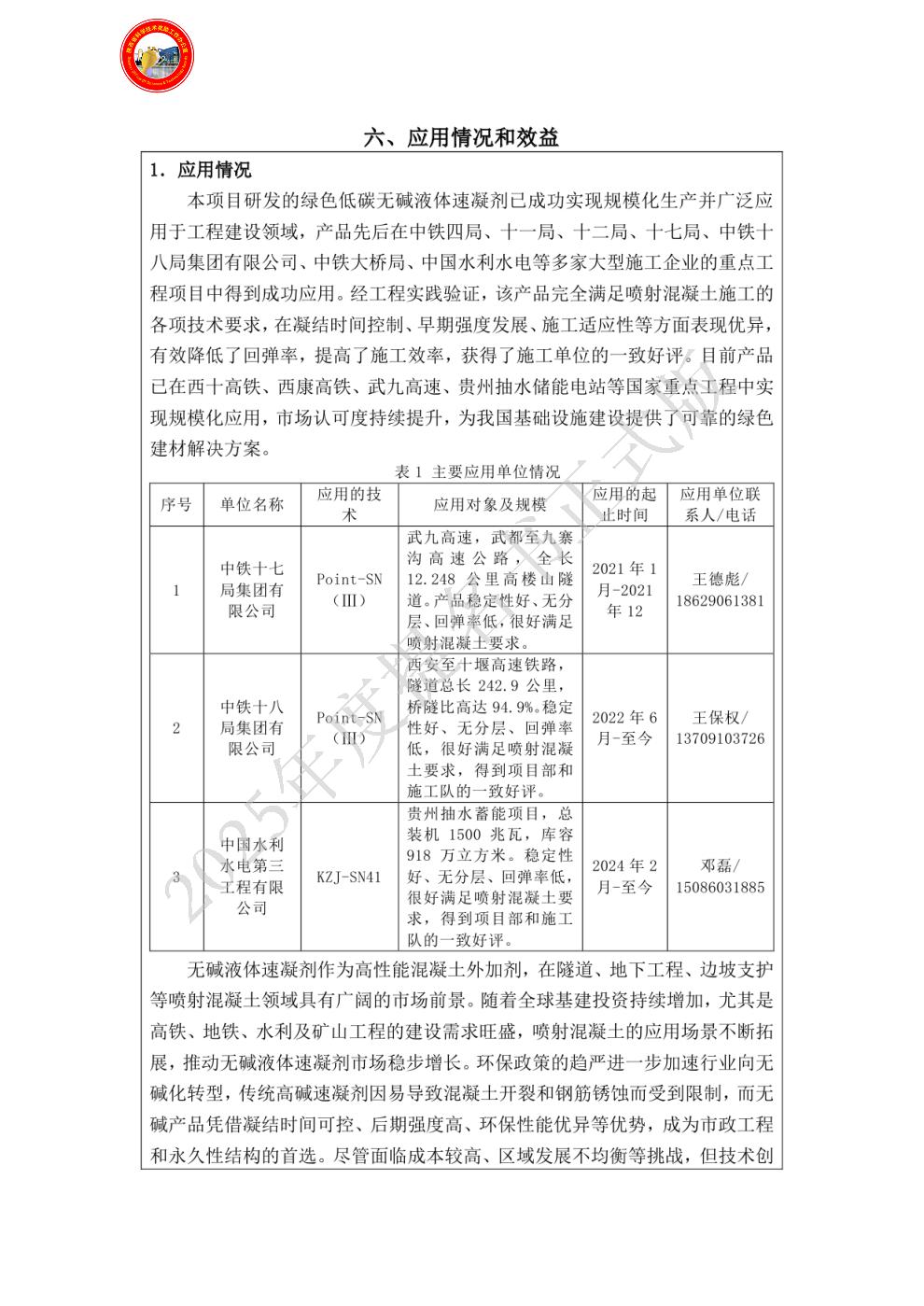单位贡献: 陕西科之杰承担了省科技厅重点研发计划“绿色低碳无碱液体速凝剂的关键技术研究”项目,组织成立了课题组。项目从文献的收集市场的调研,到绿色低碳无碱液体速凝剂产品开发的技术路线指标的确立,到目标化学结构设计等分子结构与机理研究分析,再到产品性能的分析测试、工业化研究,进行了完整的技术体系开发研究。最后研究开发了一种绿色低碳无碱液体速凝剂产品。