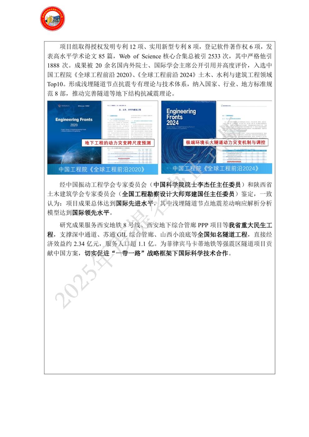 | 提名单位意见: | 本项目聚焦我国隧道工程地震灾害防御重大需求,针对浅埋隧道节点抗震薄弱环节,系统攻克了土-结构动力相似性匹配、差动响应解析建模及灾变控制等核心关键技术难题。研究成果获国内外同行高度评价,成功应用于西安地铁8号线、西安地下综合管廊PPP项目、深中通道、苏通GIL综合管廊等隧道工程,支持菲律宾马卡蒂地铁等“一带一路”工程建设。经中国振动工程学会与陕西省土木建筑学会专家委员会鉴定,项目成果整体达到国际先进水平,其中浅埋隧道节点地震差动响应解析分析模型达到国际领先水平。该项目兼具理论突破、技术创新和重大工程应用价值,社会经济效益突出,对我国隧道和地下工程抗震技术发展具有重要推动作用。 |