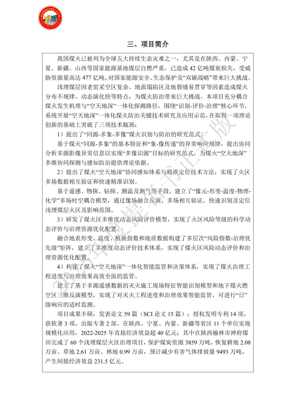 | 提名单位意见: | 本项目以陕西、内蒙、宁夏、新疆等中国北方主要煤炭产地为研究区,以埋藏深度在150m以前的煤层为主要研究对象,针对煤田火区识别定位方面、风险等级评级方面和灭火工程智能监管等三方面存在的技术局限性,围绕“识别-评价-治理”三大核心环节开展研究,解决灭火识别、治理资源优化配置和灭火工程智能监管等技术瓶颈。