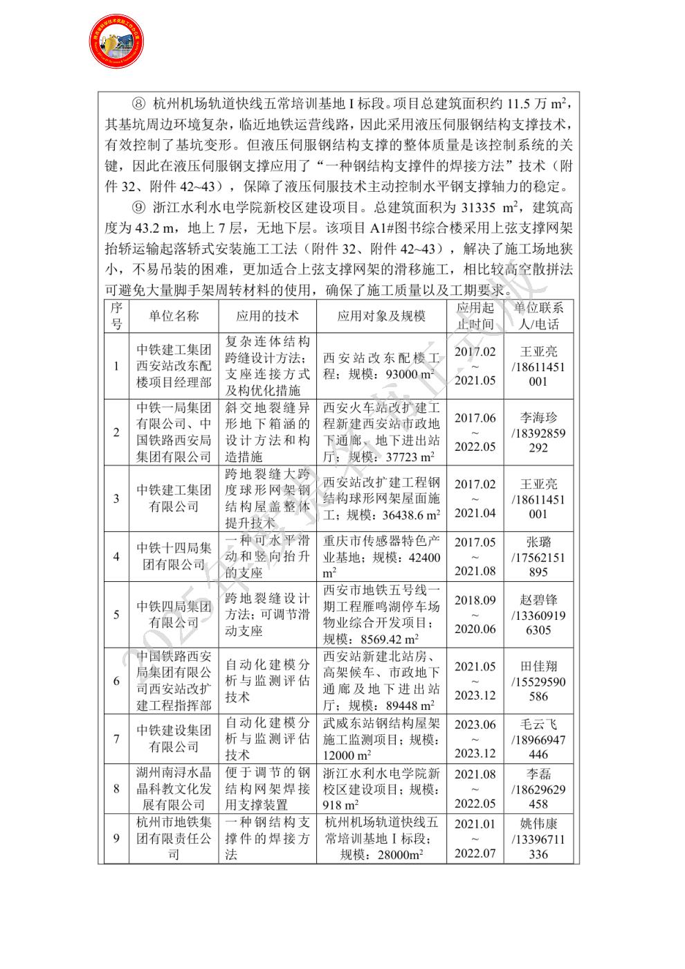 单位贡献:作为项目主要完成单位,参与了该项目子课题【铁一院科18-42】《多种复杂边界条件下大跨度三孔箱涵的力学性能研究和设计优化》、【铁一院科16-59】《西安站改东配楼结构跨越地裂缝关键技术研究》的相关工作。协助制定三孔异形箱涵整体结构双向受压性能试验的加载步序,以及模拟分析的边界条件假定。为跨地裂缝建筑地下结构的设计提供了有力的技术支撑,相关研究成果可为类似工程问题提供宝贵的施工经验。其次,针对斜跨地裂缝区域的屋面拱形大跨度钢结构网架,因施工场地狭小而造成施工分段复杂等问题,通过PDCA循环、理论与实践结合的方法,不断优化施工方案,确定了合理的施工步骤和方法,确保跨地裂缝大跨度球形网架钢结构屋盖整体提升施工的顺利开展。通过科学的施工组织,减少因地裂缝地质影响造成的施工困难。协助完成了钢结构跨越地裂带抗滑移支座的研发与应用,提高了施工功效,缩短工期,同时具有广阔的市场前景和推广价值,可为钢结构施工技术的发展提供有力保障和技术储备,提升行业竞争力。