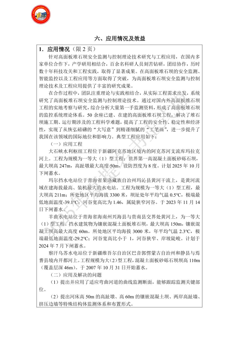 单位贡献:中国电建集团西北勘测设计研究院有限公司作为本项目的牵头单位,负责整体技术路线规划与科研大纲编制依托西北院设计的大石峡、玛尔挡、羊曲、苗家坝、察汗乌苏等数十座水电站,总结提炼了高坝、高寒、高地震烈度、深厚覆盖层、狭窄河谷(以下简称“三高一深一窄”)条件下高面板堆石坝及特殊结构体安全监测面临的问题和不足,梳理总结提炼了需要解决的关键技术问题。构建了复杂条件下高面板堆石坝安全监测体系,提出了高趾墩、高趾墙和挤压边墙等特殊结构体的监测方法与布置形式,创新了适应弯曲河道的曲线监测断面、面板柔性与固定测斜仪多基准算法,解决了“三高一深一窄”复杂条件和高面板堆石坝特殊结构体安全监测难题(创新点一)。开发了复杂条件下高面板堆石坝的多场信息智能感知系统,配合南瑞集团公司研发了新型水管式沉降仪与杆式位移计,发明了电磁沉降环自动感知技术,主导提升了适应工程应用的柔性管道机器人监测技术,解决了超长距离、大量程、高精度监测难题(创新点二)。联合西安理工大学、河海大学等单位,共同构建了复杂条件高面板堆石坝多测点变形智能监测模型,提出了面板堆石坝模型计算参数反演分析的机器学习方法,研发了高面板堆石坝安全性态多位预警与反馈技术,解决了高面板堆石坝监测馈控难题(创新点三)。