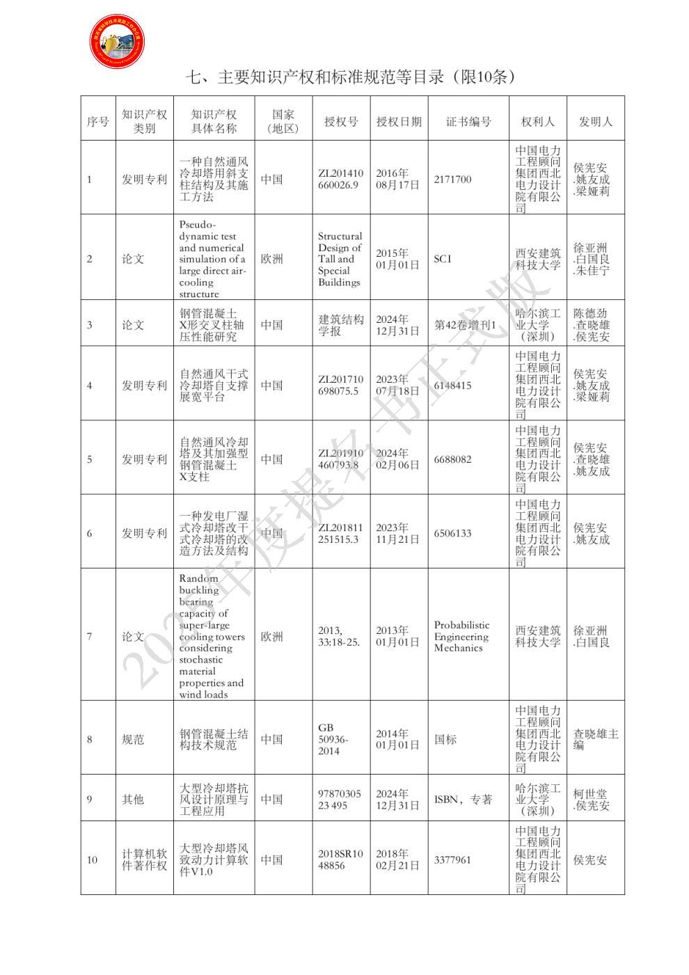 旁证材料:必备附件1.1、3.2项;其他附件2.1、2.14项. 曾获国家科技奖励情况:2024 中国电力科学技术奖,三等奖,超大型冷却塔结构体系创新关键技术与工程应用,排名3 , (2024-J-3-132- G03) ;