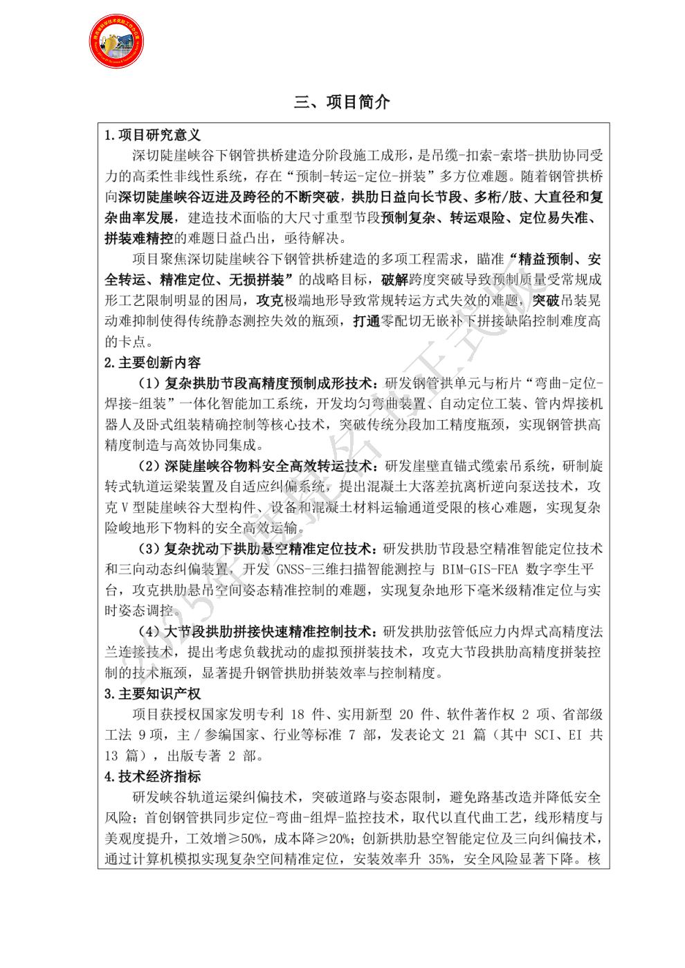 单位贡献:主攻拱肋架设关键技术,创新“节段悬臂拼装+临时扣挂”工艺,突破大跨度拱肋线形控制难点,合龙精度达+10mm。研发的峡谷风荷载动态调整技术,保障强风环境下施工安全。