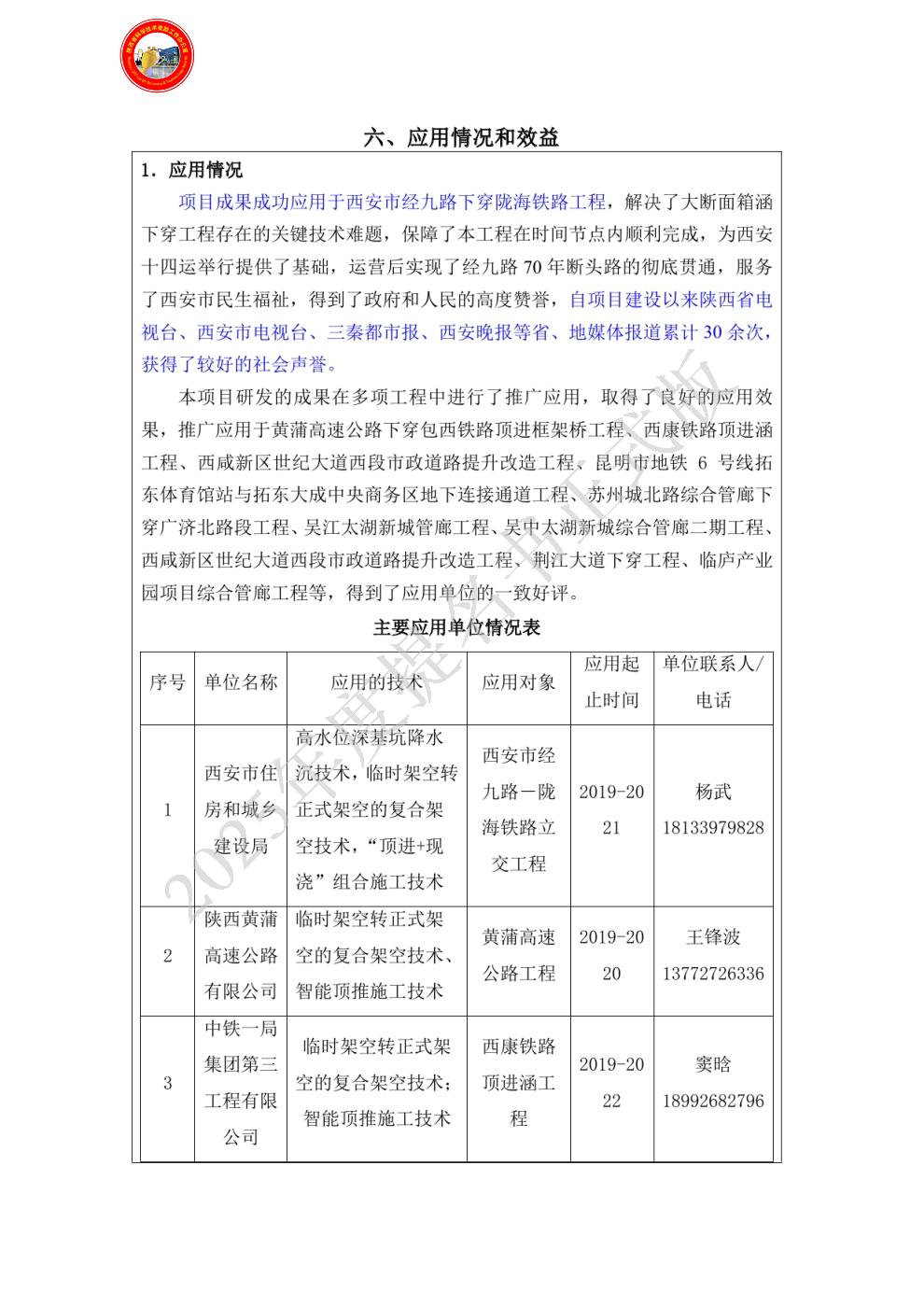 单位贡献:中铁二十局集团有限公司是项目下达与管理单位,参与研发了新型便梁、工字梁、轨枕换铺吊装机具等施工配套装备,提出了高水位黄土地层深基坑降水控沉方法,提出了大断面箱涵长距离下穿运营铁路的“顶进+现浇”综合施工技术。对创新点2、3有贡献。对项目的推广应用均做出了重要贡献。(必备附件1.1、1.2、1.3;其他附件2.1、2.6、2.9)
