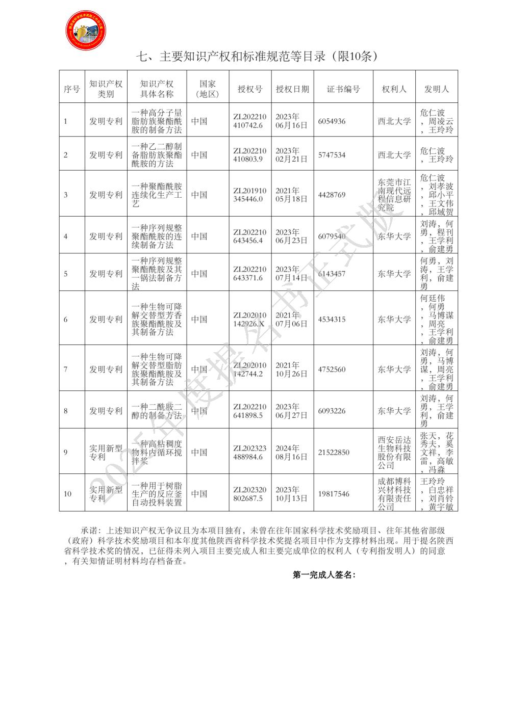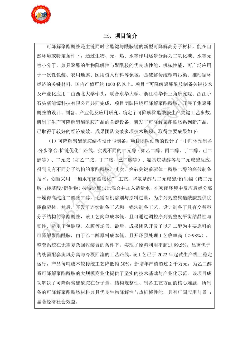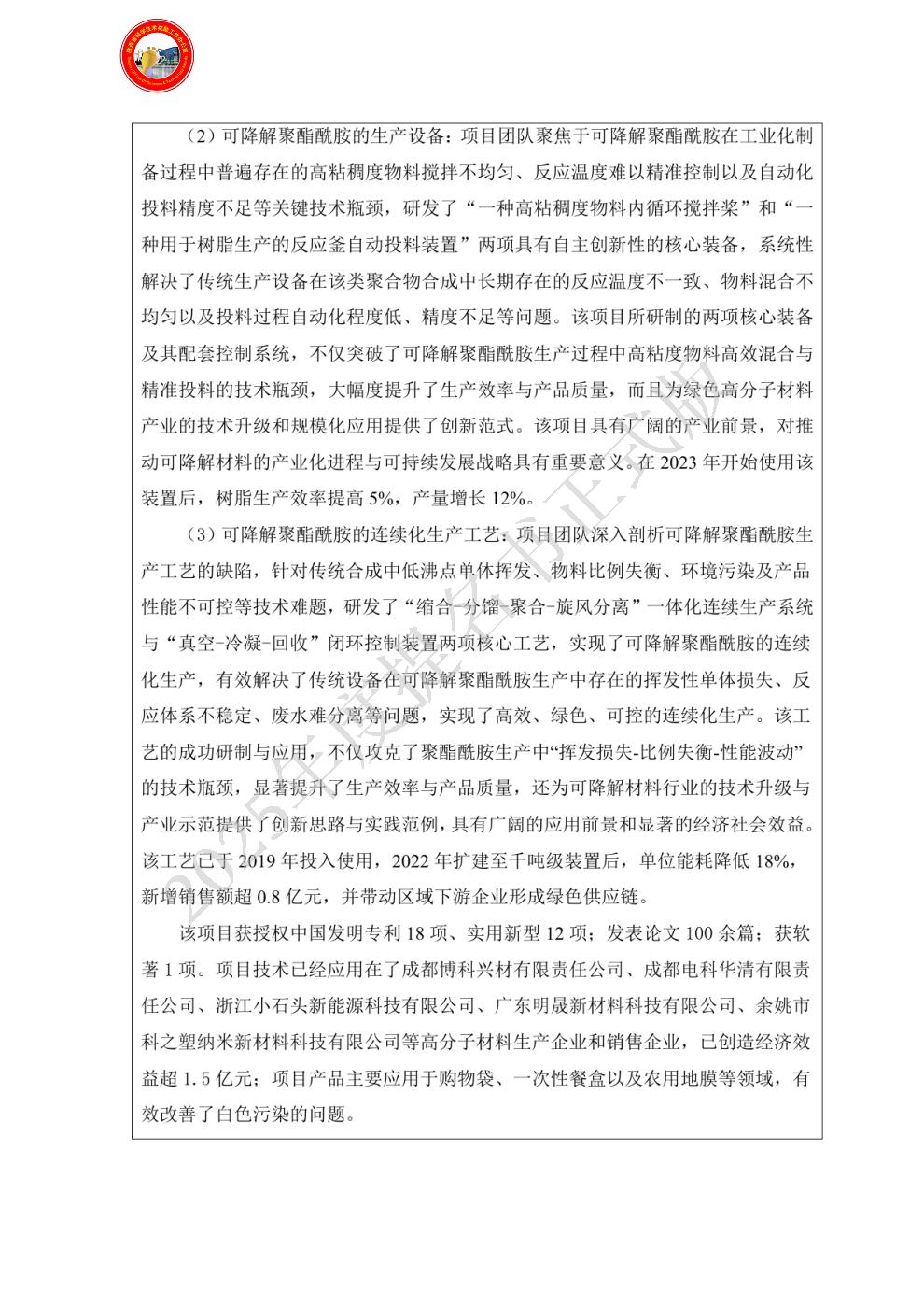 排名:2 行政职务:无 技术职称:教授 工作单位:西北大学 对本项目技术创造性贡献:主要承担煤基乙二醇制备可降解聚酯酰胺及其表征等工作。 曾获国家科技奖励情况:2025,陕西省高等学校科学技术研究优秀成果三等奖,高分子材料的可控制备、组装与性能调控,1/10. - 姓名:何勇
