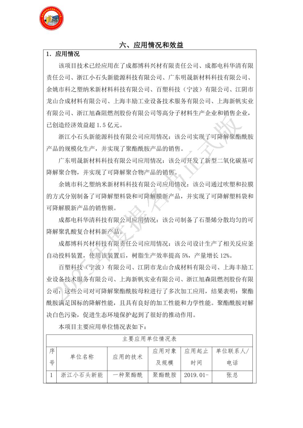 排名:10 行政职务:无 技术职称:无 工作单位:浙江小石头新能源科技有限公司 对本项目技术创造性贡献:主要承担可降解聚酯酰胺的产业化生产、推广及应用等工作。 曾获国家科技奖励情况: