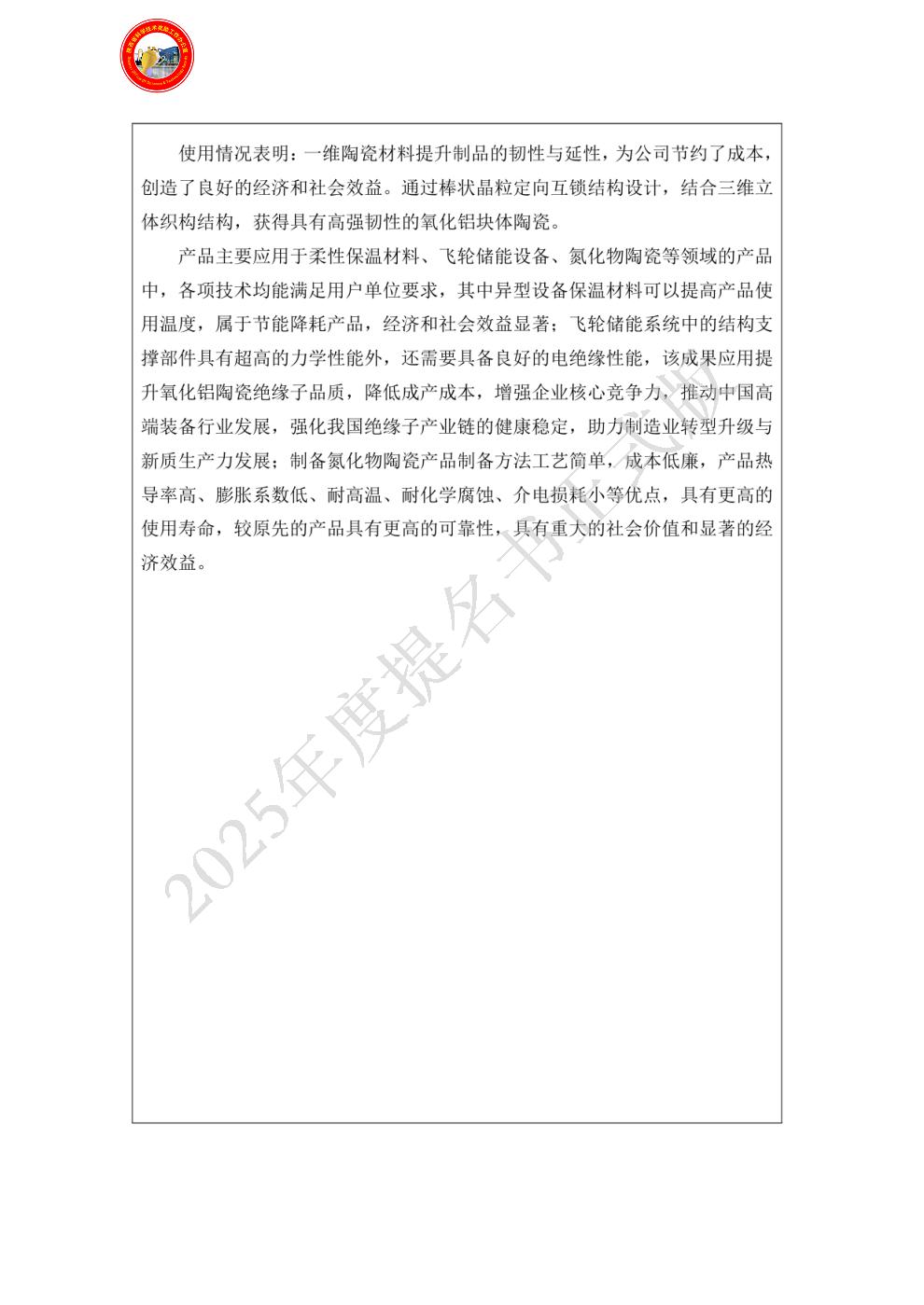 | 提名单位意见: | 项目围绕一维陶瓷材料在结构功能一体化方面的应用难题,以国家级科技项目和国家重大需求为依托,历经十余年产学研用协同攻关,针对一维陶瓷材料在微纳尺度结构控制与相互组装系列问题,先后开发了氧化铝基连续纤维纳米棒状晶组织定向技术、晶须搭接结构多孔陶瓷微观结构控制技术和低成本纤维组装晶须次级结构构建技术等多项国内领先的创新技术成果,并在飞轮储能设备、高温烟气过滤、柔性保温材料等领域实际应用,成功满足氧化铝材料增韧、多孔材料增强等多项技术需求。项目推广至今,应用单位增加销售收入3亿元。