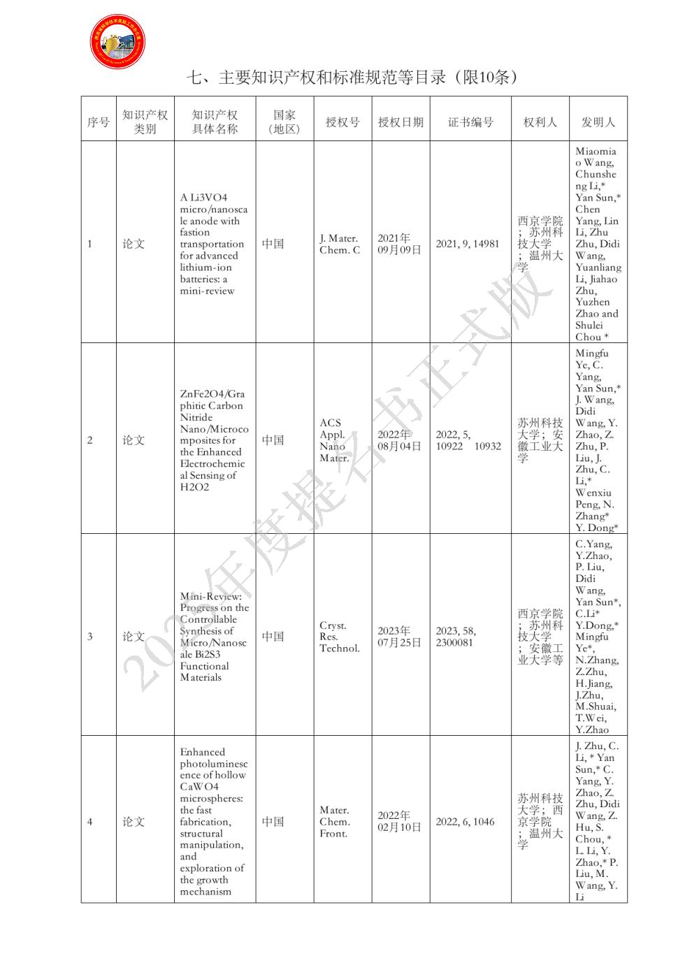 排名:1 行政职务:学术带头人 技术职称:教授 工作单位:苏州科技大学 对本项目技术创造性贡献: 本人为项目负责人。负责设计了材料结构,探索了合成规律:利用一种微波辐射技术制备高纯Li3VO4 纳米结构(包括空心纳米球、纳米花、空心纳米立方体及纳米线)。根据不同反应历程的结构和形貌的演变规律,推断出:Li3VO4 纳米材料的生长过程经历了“溶解-重结晶-奥斯特瓦尔德熟化”三个阶段,为低成本、高效制备材料提供实验基础。在Cryst. Res. Technol. 发表SCI 论文1篇;授权国家发明专利4项ZL202310002359.1、ZL2023100023089、ZL202310037887.0、ZL202310037886.6;有利支撑了本项目的研发和产业化。 曾获国家科技奖励情况:1、2024年,陕西高等学校科学技术研究优秀二等奖(第一);