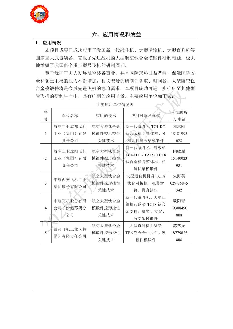 | 主要完成单位及创新推广贡献: | - 单位名称:西安三角防务股份有限公司