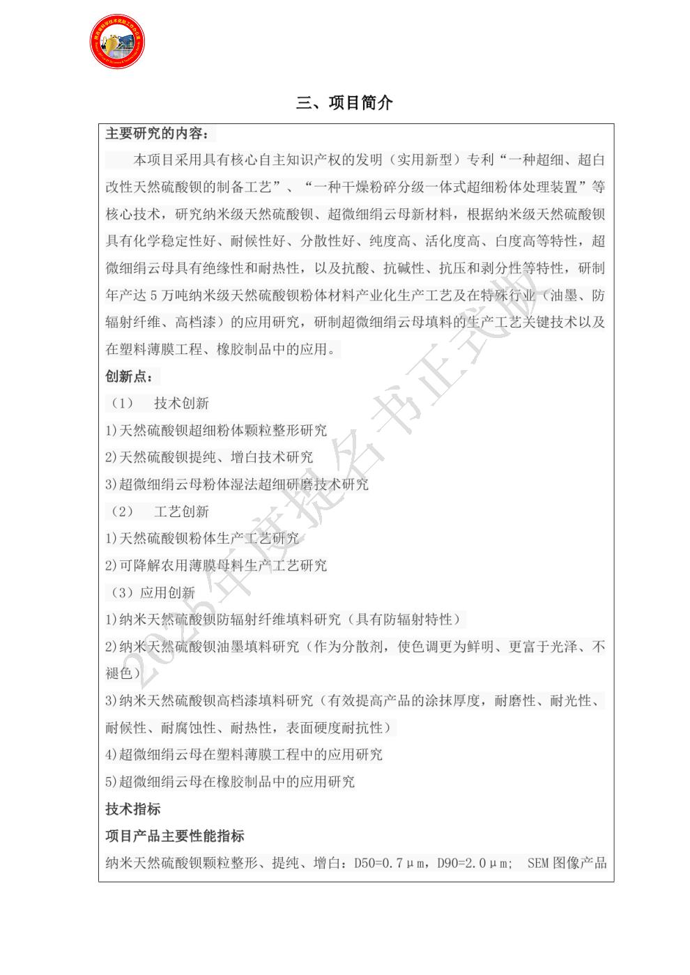 | 提名单位意见: | 年产 5 万吨无机非金属粉体材料产业化及行业应用研究项目,既是 “经济效益显著、技术竞争力强、绿色可持续” 的优质产业化项目,也是 “推动行业升级、赋能区域经济、服务国家战略” 的关键支撑项目。其核心价值在于:通过 “规模化 + 高端化 + 应用化”,破解行业 “低端过剩、高端短缺” 的矛盾,同时为下游产业降本提质,项目的实施最终了实现 “企业盈利、行业升级、区域发展、国家受益” 的多赢格局。