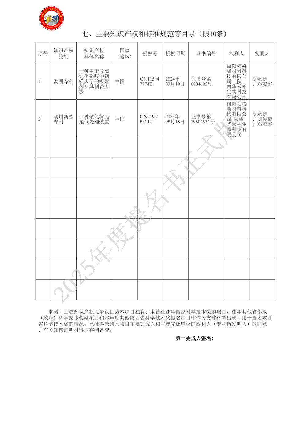 排名:2 行政职务:无 技术职称:助理工程师 工作单位:旬阳领盛新材料科技有限公司 对本项目技术创造性贡献:负责吸附剂材料的合成从单体骨架结构选择、改性、工艺路线、合成控制以及应用方法,用时2年有余以及和其他材料相关对照实验进行实时对照,做到数据可控、路线可控、原材料可控,可实现工艺的放大和吸附材料的工业化生产;负责项目立项和项目启动以及项目实验的合成和具体实验开展和产品最终的应用,并负责项目资料的整理和相关专利申报。对应科技创新的核心技术内容①②③④⑤。 曾获国家科技奖励情况:2022年获《均粒复合磁性吸附材料提取钒技术研究》陕西省科技工作者创新创业大赛二等奖;