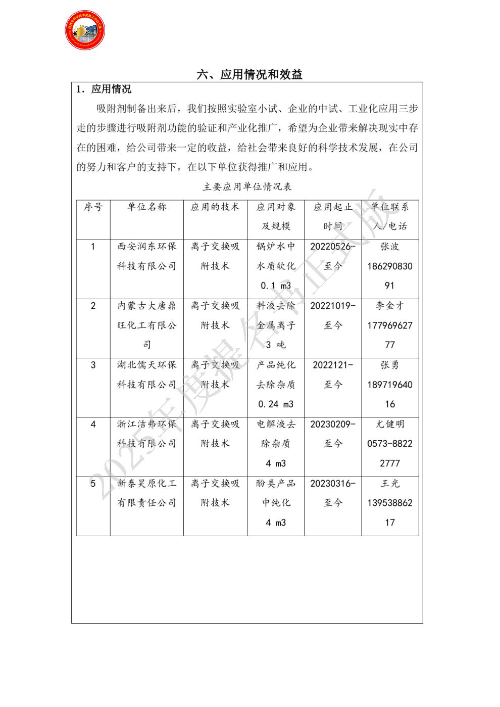 | 提名单位意见: | 该项目通过开展基于界面调控的高容量钙镁吸附剂创制及资源化回收应用的研究,发明了“一种用于分离纯化磷酸中钙镁离子的吸附剂及其制备方法”。 该发明从基体的苯乙烯骨架结构为立足点,将柔性单体改性到苯乙烯刚性骨架上,并通过温和的条件对半产品进行树脂功能化实现研究目标。工艺具体为在聚合工艺中加入柔性单体(链型单体)改变传统苯乙烯单体的刚性结构并降低聚合工艺中的活化能;整个合成工艺原材料成本低,合成路线成熟,低温易控制,对环境友好 ,具有广泛的技术推广和应用价值。项目开发的产品已广泛应用于改善人类健康;保护关键设备;提高料液精度;提高电子行业产品质量;促进水资源循环利用等多方面,产品市场前景广泛,具有显著的经济效益和社会效益。经审查,项目相关信息已完成提名公示,公示结果无异议。我单位认真审阅了申报材料及完成人资格,确认申报材料真实有效,相关栏目填写符合要求。 |