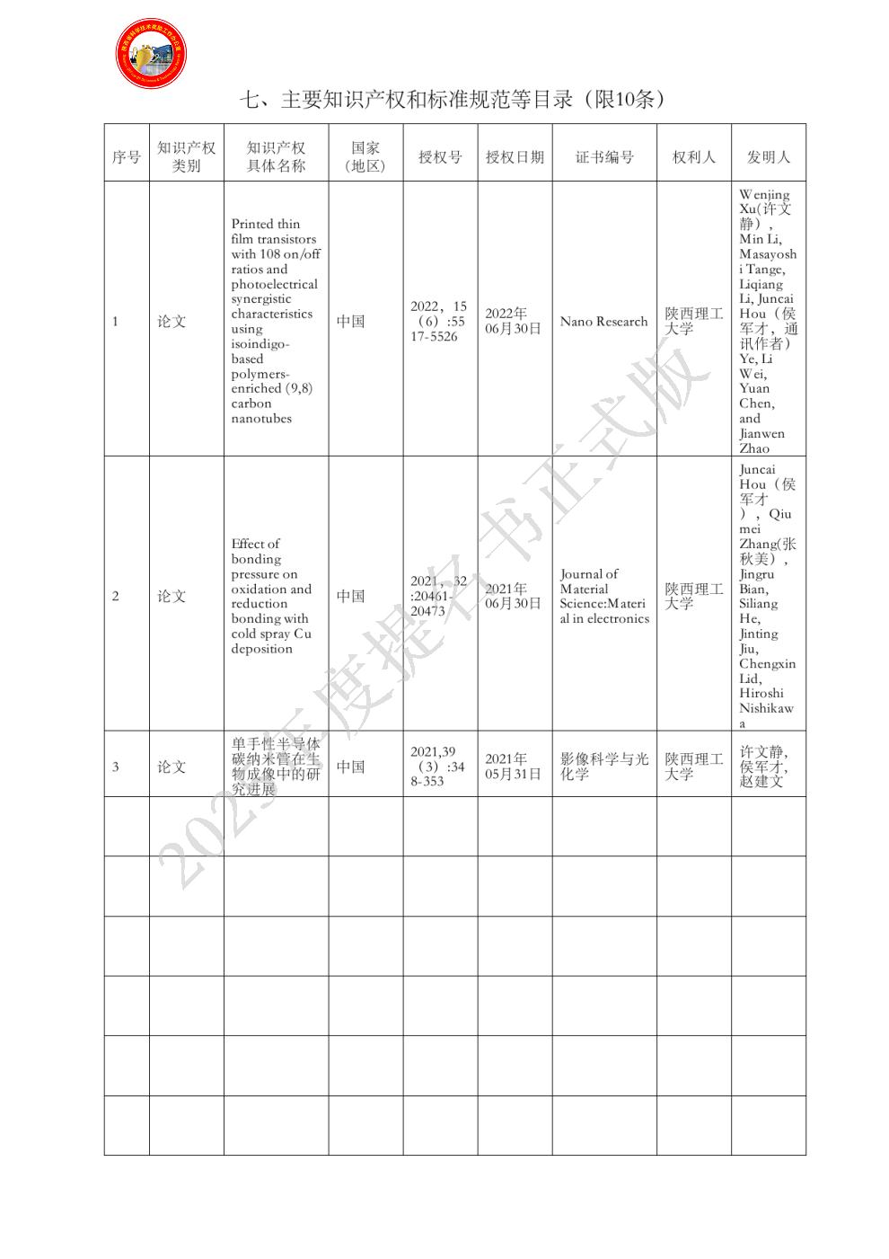 排名:2 行政职务:无 技术职称:讲师 工作单位:陕西理工大学 对本项目技术创造性贡献:纳米铜浆料制备,第二篇文章的共同作者 曾获国家科技奖励情况:陕西高等学校科学技术研究优秀成果,三等奖,排名,第二 - 姓名:许文静