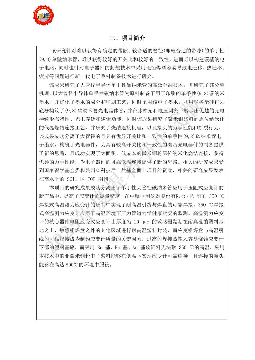 依托单位进行了单手性碳纳米管分离技术的研究,成功实现了大管径单手性半导体碳纳米管的制备,并制备了电子浆料,能够用于下一代计算机芯片的应用。而目前应用的硅基半导体为微米器件,已经接近达到硅基器件的极限。碳纳米管制备的晶体管具有更高的开关比和较好的一致性。铜微米浆料是能够实现电子器件低温焊接高温服役的关键互联材料。采用工业中用的无铅焊料难以承受较高的温度,在较高温度下、在承受较高电流密度时会产生电迁移、热迁移导致组织不稳定、蠕变、疲劳性能低,从而引起接头性能的恶化,引起严重的可靠性问题。而采用本项目开发的铜微米浆料能够在250℃-350℃够实现器件的可靠、低成本连接。本项目开发的铜浆料已经成功应用于耐350℃高温的电阻应变式应变计可靠连接。室温使用的电阻应变计采用无铅焊料焊接。但高温电阻应变计的工作温度远高于无铅焊料的熔点,导致该技术无法应用。高温电阻应变计焊接同样要求引线的焊接温度不能过高,否则焊接的高温引起的应力将导致应变片解体。采用本项目研究的铜微米浆料能够完美解决高温应变计的焊接难题,保证了应变计高温可靠服役。