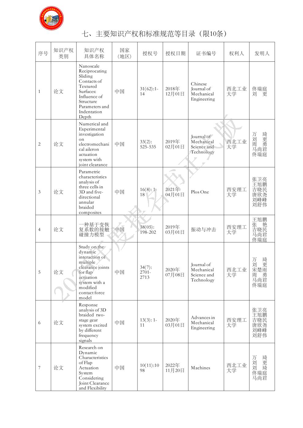 排名:1 行政职务:副院长 技术职称:教授 工作单位:西安理工大学 对本项目技术创造性贡献:项目主要完成人,负责项目整体研究方案的创新构想与实施。对推荐书“本研究的发现点、发明点和创新点”中的(1)、(3)、(4)项做出了创造性贡献,主要研究内容包括:建立了三维编织复合材料单胞参数化模型及设计系统;提出了复合材料构件间接触、摩擦及形态重构方法,完成了复合材料构件间(轴和轴承/轴套)在摩擦影响下的表面形态重构;获得了复合材料在抑制机械系统对机械系统动态输出振荡的抑制规律,将编织复合材料应用在减速器、机电副翼舵机执行等。【旁证材料:1.基金项目2项,FJ13-FJ14;2.论文3项,FJ3、FJ19、FJ21;3.专利2项,FJ24、FJ25;4.奖项3项,FJ16-18】 曾获国家科技奖励情况:① 2022年,陕西高等学校科学技术研究优秀成果奖,二等奖,执行机构铰间碰撞特性分析及应用研究,【排名:1/11】