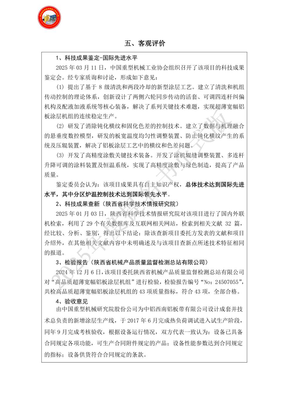 中国重型机械研究院股份公司主持完成的高品质超薄宽幅铝板涂层机组关键工艺及装备完全替代进口,打破了该领域长期被德国、英国、美国等国外厂商垄断的局面,实现了高品质超薄宽幅涂层铝板全流程、高精度、高质量、批量稳定生产,为发展我国自主知识产权的高品质涂层铝板装备与工艺提供了成功范例,同时使得我国超薄宽幅铝板涂层技术及装备具备一定的国际竞争力,带动了我国重型装备的科技进步,为保障国民经济建设,实现绿色低碳经济做出了突出贡献。