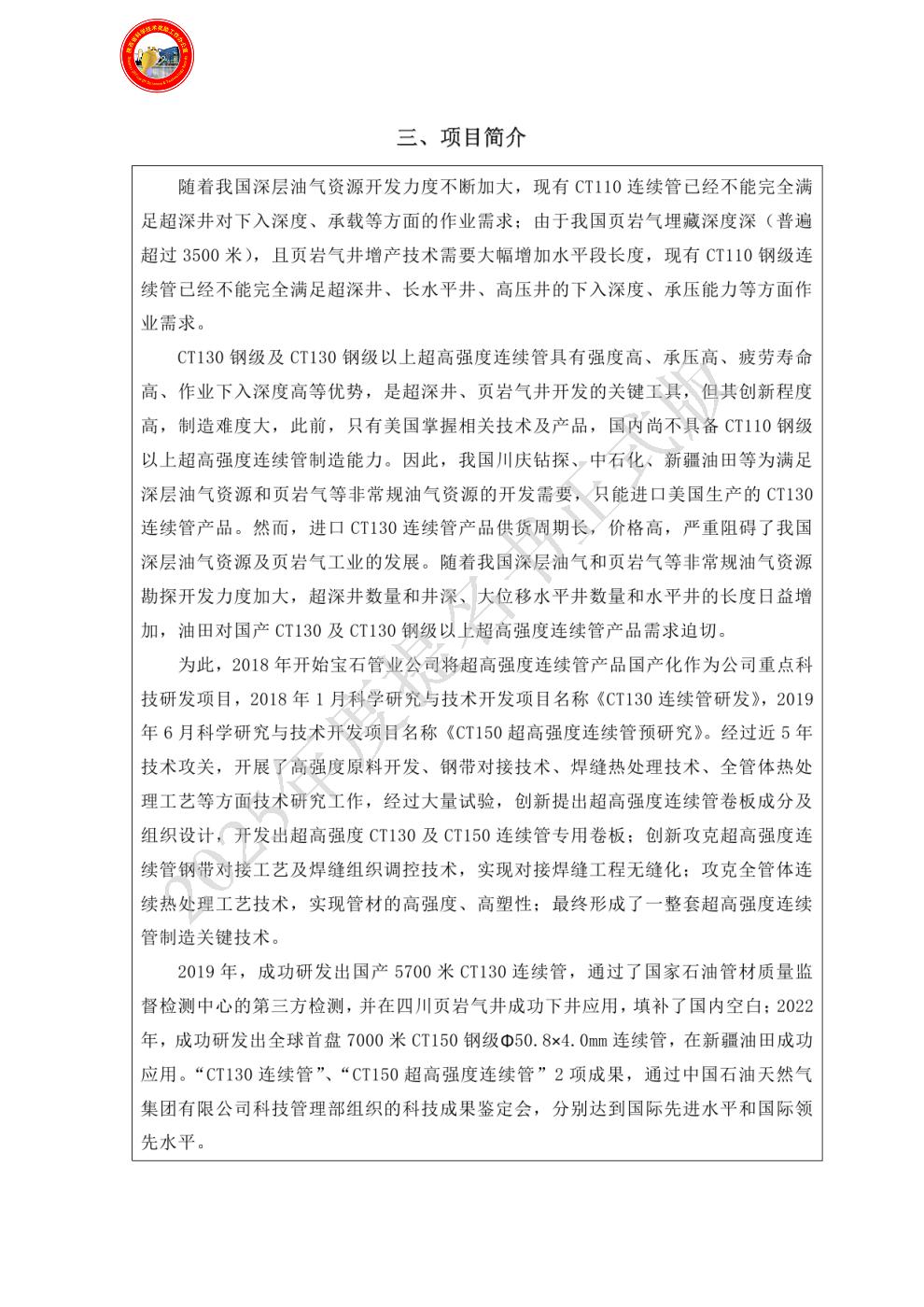 3、2022年,“2205双相不锈钢连续管关键制备技术研究及产品开发”获科技进步一等奖,厅局级,宝石钢管公司,排名5。
