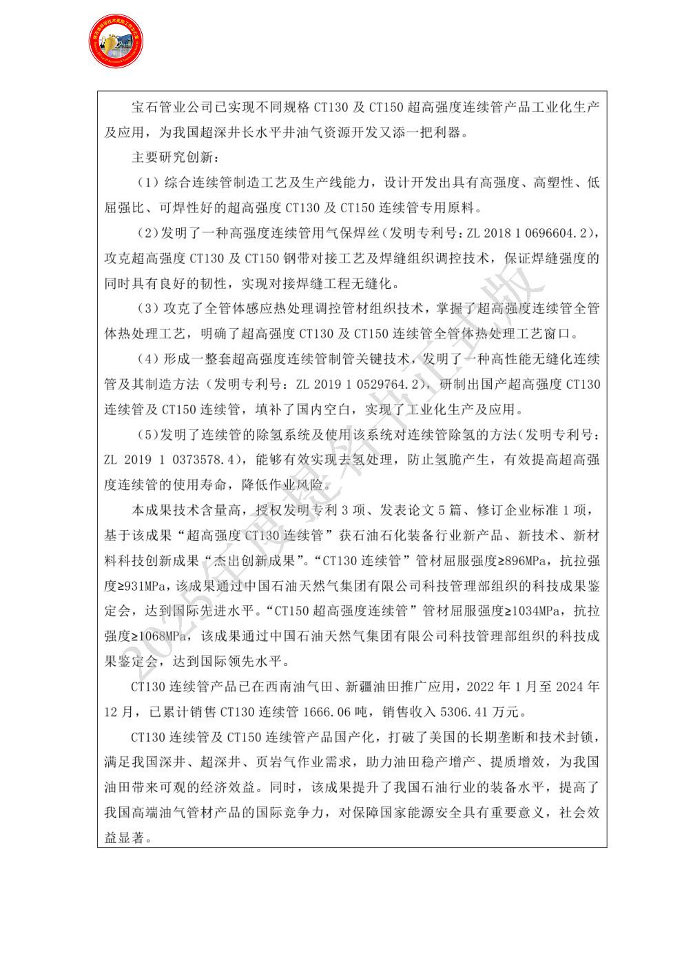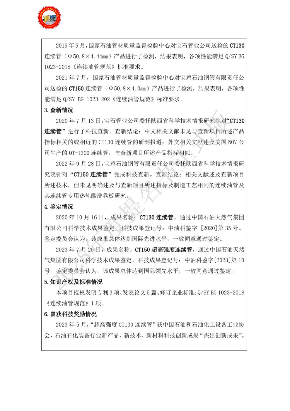 2、修订连续管相关企业标准1项,发表相关论文1篇。证明材料在附件中的编号:必备附件1-1-3;其他附件2-2-24。 曾获国家科技奖励情况:1、2017年,《超高强度CT110连续管开发》获得宝石管业有限公司技术发明奖二等奖;