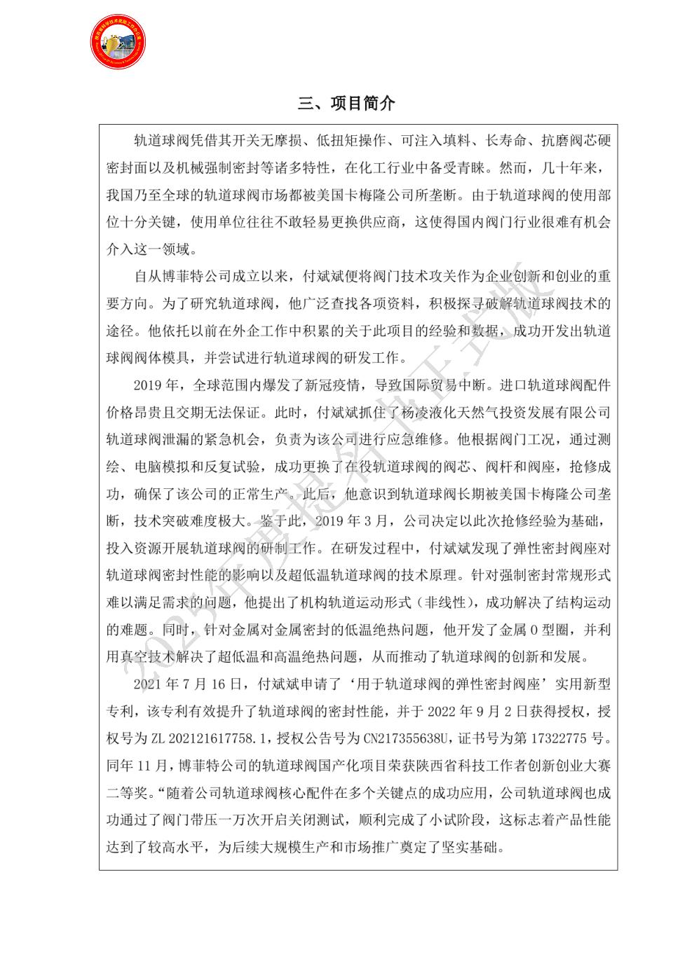 | 提名单位意见: | 项目第一完成人付斌斌,中共党员,具备高级工程师职称,是咸阳市重点培养的民营企业家代表。他先后入选2018年咸阳市企业家“雄鹰”培训计划中小企业经营管理领军人才、2021年陕西省科技厅创新人才推进计划科技创新创业人才、2022至2023年度陕西省工业和信息化部中小企业经营管理领军人才、2023至2025年陕西省工信部中小企业经营管理领军人才,并被陕西省组织部聘为特聘专家。在创新与创业领域,付斌斌成绩斐然,2023年被评为咸阳市最美科技工作者,并在2023年、2024年连续两年荣获陕西省“三新三小”创新创业大赛一等奖。他个人拥有16项实用新型专利和7项发明专利,每项专利均对行业核心价值做出重要贡献。咸阳市人民政府提名付斌斌的“用于轨道球阀的弹性密封阀座在超低温轨道球阀国产化替代中的应用”项目,代表咸阳市角逐陕西省科学技术进步奖二等奖。 |