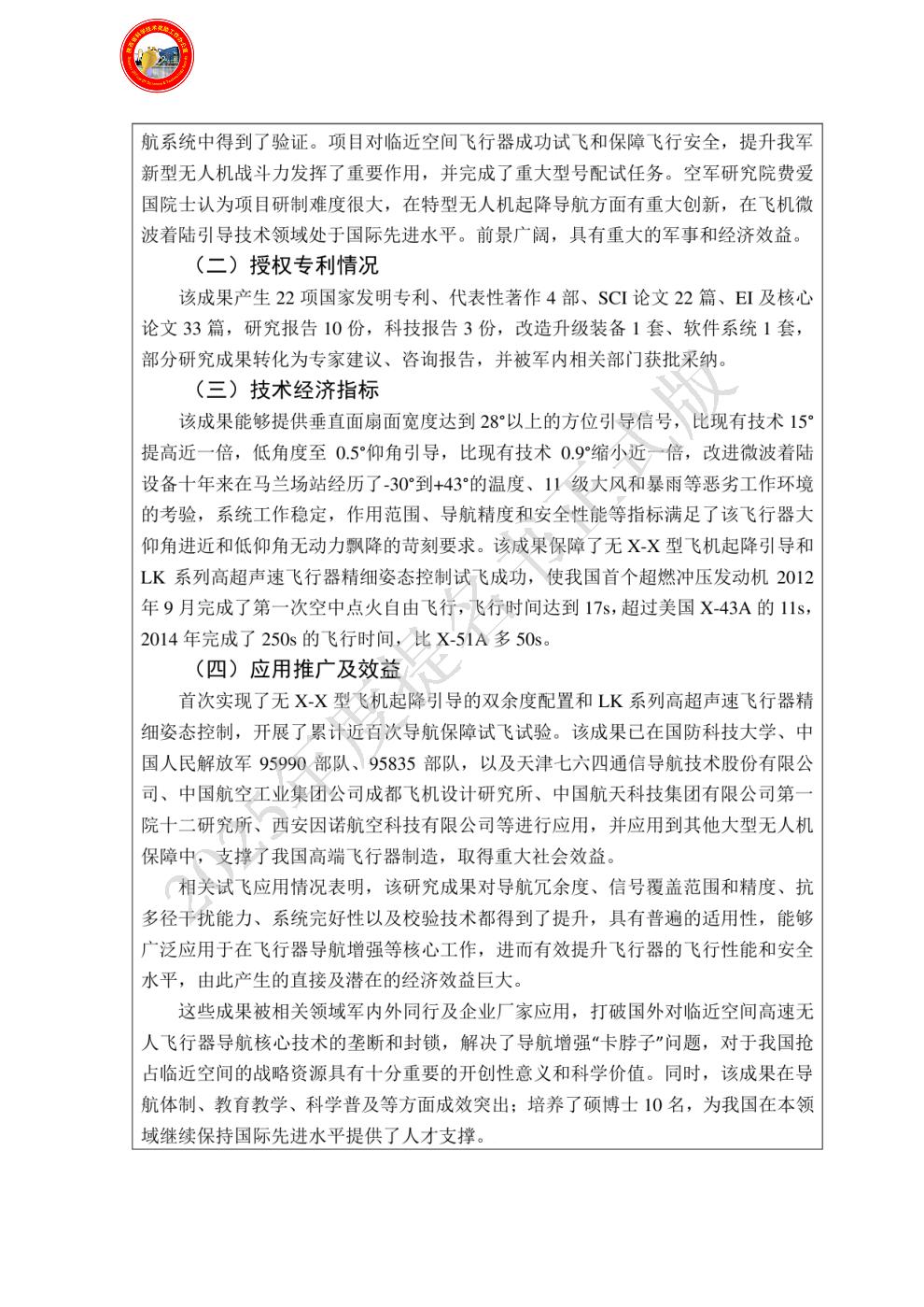 单位贡献:中国人民解放军空军工程大学为该成果的第1完成单位,主要负责为研究团队提供全过程的服务支持和相关成果的研究、开发和推广应用支持等,主要工作包括:项目组织管理及技术沟通协调、系统总体方案的设计与组织实施、相关核心理论和技术调研、各项研究内容的攻关组织等工作。同时,还协助研究团队在天津七六四通信导航技术股份有限公司、中国人民解放军XX试验训练基地马兰村场站、中航工业集团公司成都飞机设计研究所、中国人民解放军XX试验训练基地第X试验训练区等进行了示范应用,是相关成果的主体承担单位并在应用实施过程中担任过程管理和支持工作。