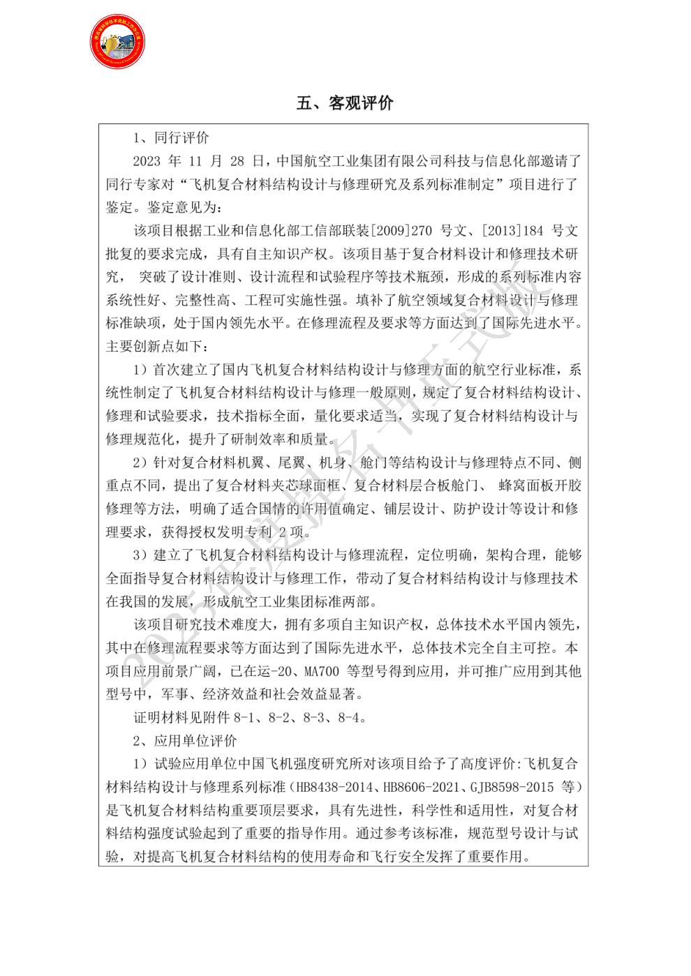 该项目在消化吸收国外先进标准、总结国内研制经验的基础上,提炼和形成了3项复合材料结构设计与修理方面的标准(HB 8438-2014《民用飞机复合材料结构设计通用要求》、HB 8606-2021《飞机复合材料结构修理通用要求》、GJB 8598-2015《飞机复合材料结构设计通用要求》),为我国飞机复合材料结构设计和修理提供了最新、最完备的准则和指导依据。该项目建立了完整的复合材料结构设计准则,系统性地提出了复合材料结构设计与修理的一般原则,详细规定了复合材料结构设计和试验要求,规范了飞机复合材料结构设计和修理流程。相关成果已授权发明专利2项,实用新型专利2项,发表科技论文2篇。该项成果技术水平国内领先,复合材料结构修理流程达到了国际先进水平,研究成果已成功应用于运-20飞机、MA700项目中,可推广应用于其他军民用飞机上。其中运-20飞机作为自主研发的大型运输机,完成了抗疫物资运输、接志愿军烈士遗骸回国等多项重要任务,其社会、经济和军事效益显著。