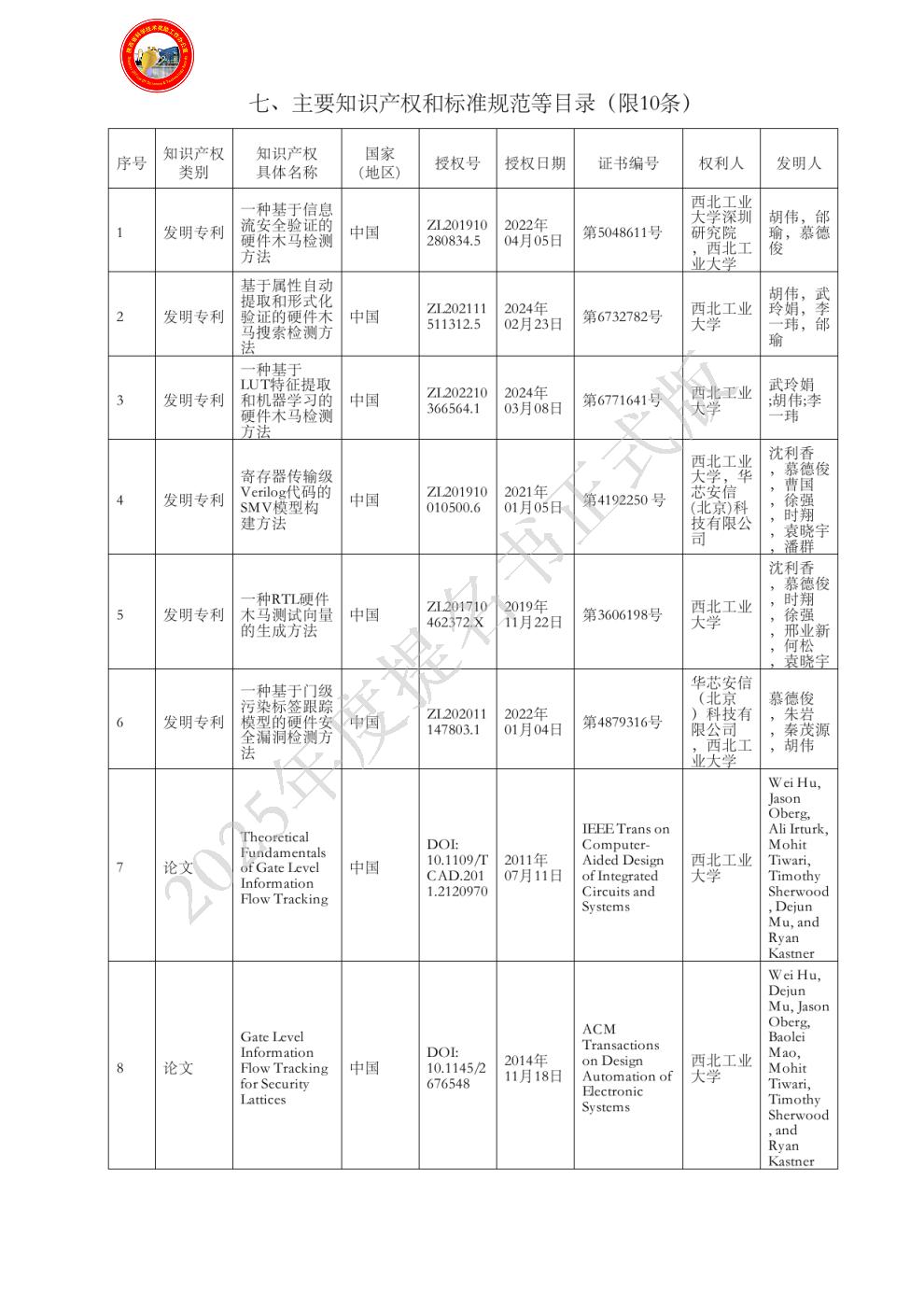 排名:5 行政职务:无 技术职称:助理研究员 工作单位:西北工业大学 对本项目技术创造性贡献:完成人参与了芯片设计安全脆弱性特征提取与智能匹配技术研究。科技创新成果2-1:融合芯片设计结构和行为特征的安全脆弱性特征提取技术;科技创新成果2-2:基于智能化特征匹配的安全脆弱性检测技术;在该项目研发工作中投入的工作量占本人工作量的40%。 曾获国家科技奖励情况:2024年,陕西高等学校科学技术研究优秀成果特等奖,芯片设计安全脆弱性分析技术及应用,排名9,证书无编号。 - 姓名:沈利香