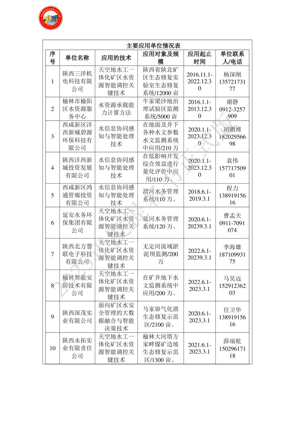 | 提名单位意见: | 本项目在国家自然科学基金及省部级科研项目的支持下,紧扣国家“智慧水利”与矿区绿色发展战略需求,首次提出并系统构建了“天空地水工”一体化矿区水资源智能调控关键技术体系。项目以“理论规律研究—关键技术研发—智能调控平台构建”为总体思路,突破了单一监测感知手段难以满足水利全要素、全过程智能感知的瓶颈,创新性地提出了“天空地水工”五位一体监测模式,实现了从数据采集、智能处理到智慧决策的时空融合。在技术层面,项目形成了多源异构数据智能融合方法,开发了水利信息数据中台和计算分析基础数据库,构建了覆盖降水、蒸发、土壤墒情、地下水等关键环节的水文水动力模型工具集。通过人工智能与数字孪生深度融合,提出了水利知识图谱驱动的决策支持方法,实现了对水资源调度、防洪抗旱、水质监测、水利工程安全等多业务场景的智能化支撑。项目成果在矿区水资源管理、防洪预警、生态修复等方面得到应用,为保障黄土高原能源基地生态安全和水资源可持续利用提供了有力技术支撑。在成果产出方面,发表论文20余篇,获授权发明专利3项、软件著作权22项,相关成果分别获得2021年和2023年陕西省高等学校科学技术一等奖,具有广泛的学术影响,产生了显著的经济和社会效益。成果材料齐全、规范。无知识产权纠纷,人员排序无争议,符合陕西省科学技术进步奖提名条件。