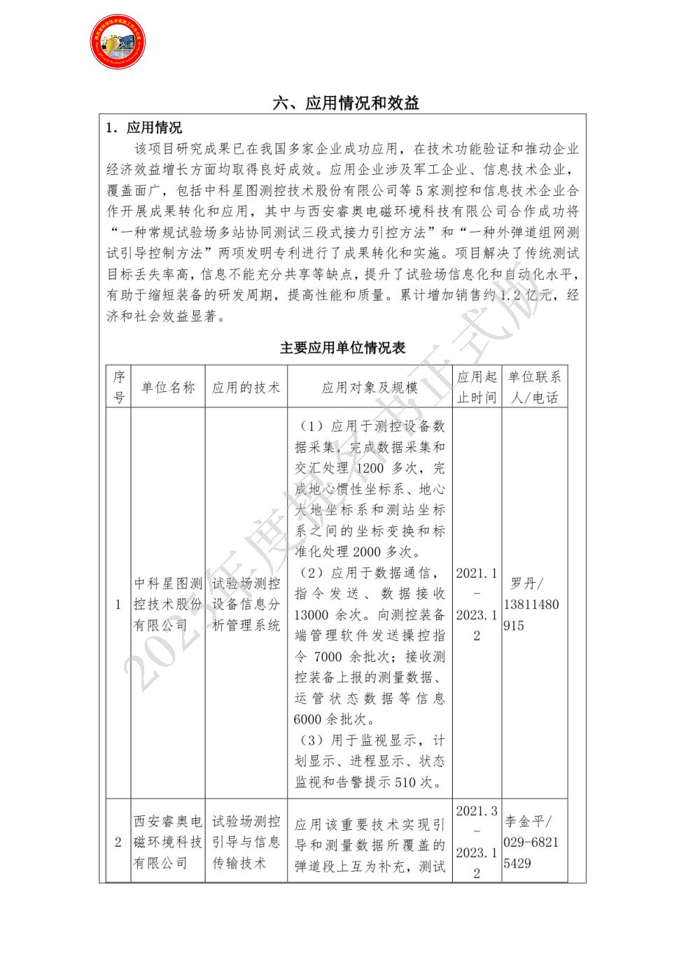 单位贡献:西京学院项目团队聚焦试验场测控引导与信息化关键技术研发、成果转化及应用推广。作为本项目第一完成单位,全面负责项目的总体规划、项目组织和实施,为本项目的顺利开展提供了大力支持和充分保障。对本项目科技创新和应用推广情况的贡献主要体现在:负责试验场测控引导与信息化关键技术研发;制定总体研究思路及技术路线;研发常规试验靶场多站协同测试接力引控方法提出外弹道组网测试引导控制方法;提出基于高阶统计特征的多波段雷达检测方法,设计高速电力线载波通信系统,建立电波传播路径衰落模型、电波折射误差修正方法和电波极化模型;与合作单位共同实施成果转化工作。