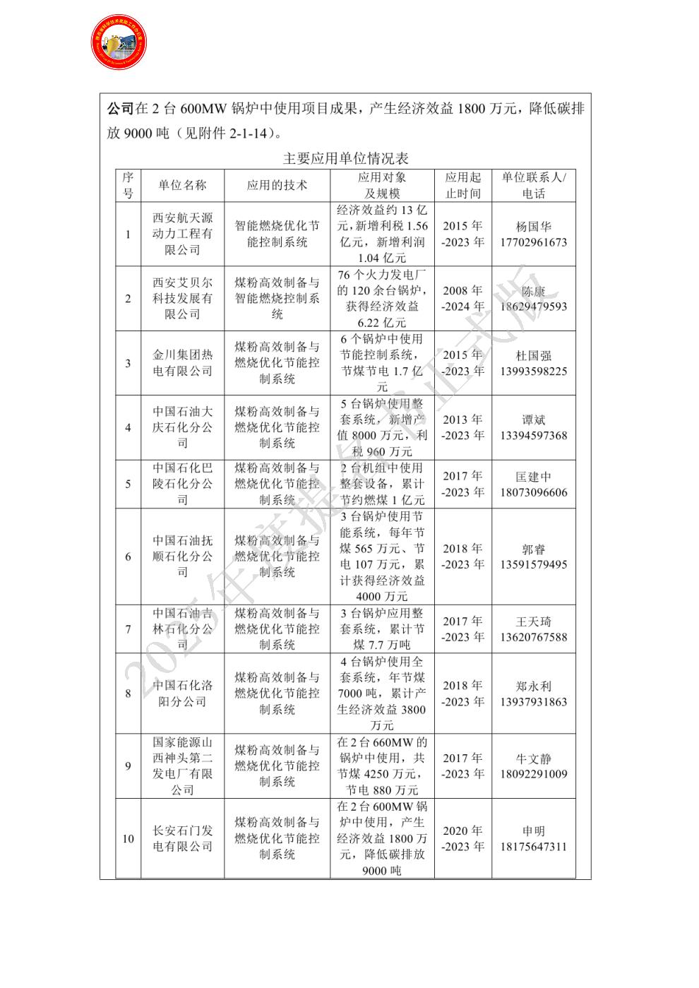 单位贡献: 西安艾贝尔科技发展有限公司作为项目的主要研发和推广单位,与西安理工大学、西安交通大学共同承担了国家、省市科技攻关项目,在煤粉燃烧智能检测装置和节能优化控制系统的原创性开发方面做出了突出贡献。开发并推广了煤粉制备与智能燃烧优化节能控制系统的检测装置和设备,实现了丹麦SMITH,美国SVEDALA,日本SANKYO等知名公司检测产品的国产化替代,研究成果先后在中石油、中石化、国能等煤粉利用与燃烧企业的120余台装备中投入使用,为企业的节能降碳做出了重要贡献。