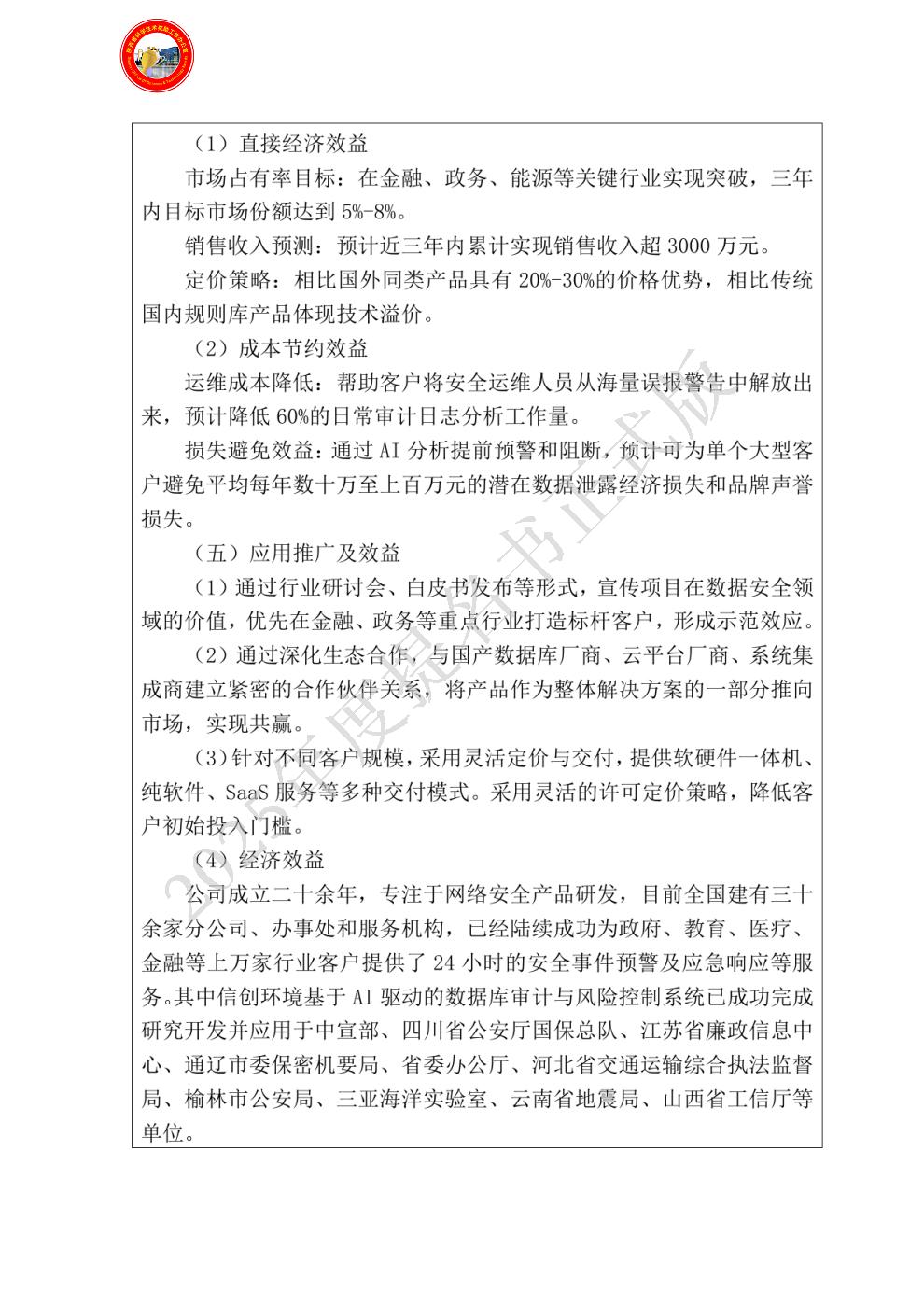 | 提名单位意见: | 信创环境基于AI驱动的数据库审计与风险控制技术研究与应用项目旨在通过国产化适配、数据库访问风险的智能检测和实时响应,解决“卡脖子”威胁识别与高级威胁防护难题。其技术先进性与产业前景已得到政策与市场的双重验证,将成为信创生态中数据安全的核心支柱。该项目可提升我国网络安全防护水平,保障国家信创环境关键基础设施的安全稳定运行,提名该项目为陕西省科学技术进步奖三等奖。 |