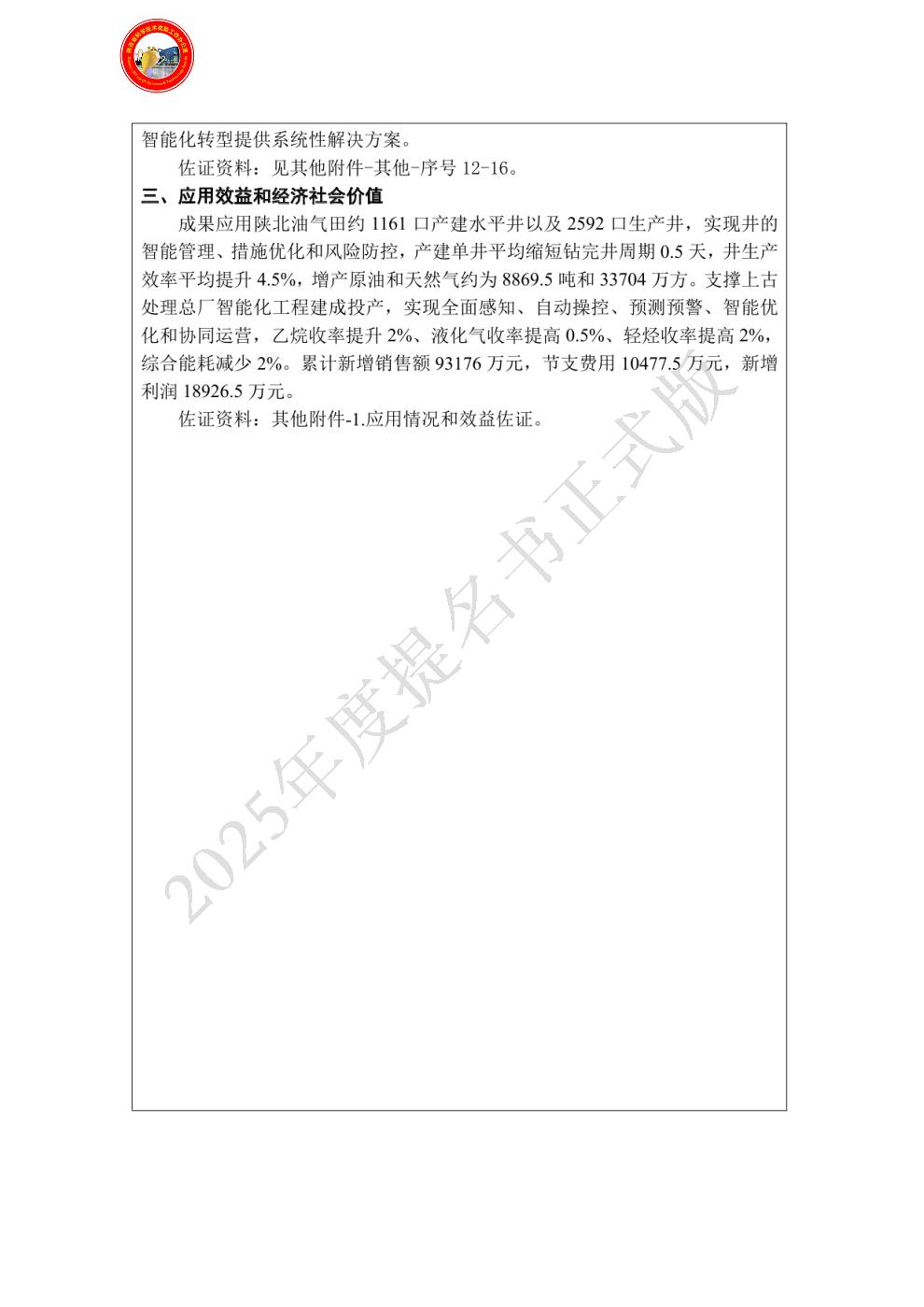 该项目成果创新显著,解决了油气行业智能化转型中的多项关键技术问题;技术成熟度高,已形成稳定生产能力并广泛应用于规模化应用阶段;应用效果显著,创造了巨大的经济效益和社会效益;推广价值广泛,为国内油气田智能化转型提供了系统性解决方案和成熟范例,对推动陕西企地联合发展和国内油气行业科技进步具有重大意义。