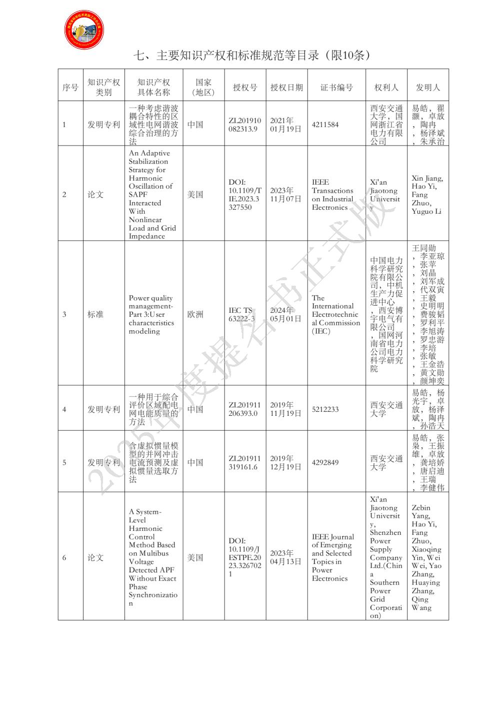 4)牵头制定IEC国际标准《Power quality management–Part 3: User characteristics modelling》。(主要知识产权等目录附件3)