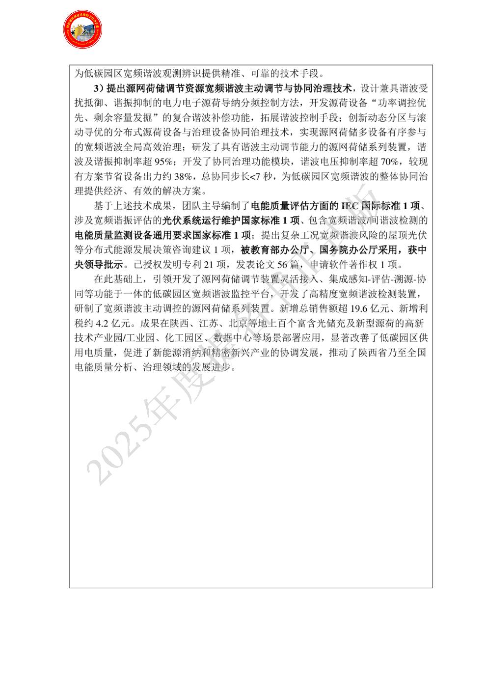 排名:7 行政职务:技术总监 技术职称:正高级工程师 工作单位:西安博宇电气有限公司 对本项目技术创造性贡献:研究低碳园区电能质量监测设备技术标准与规范,设计优化宽频时变谐波检测技术,研制适用于多源互扰宽频谐波的监测设备,全方位参与园区高品质供电系统的设备集成与应用推广工作。具体包括: