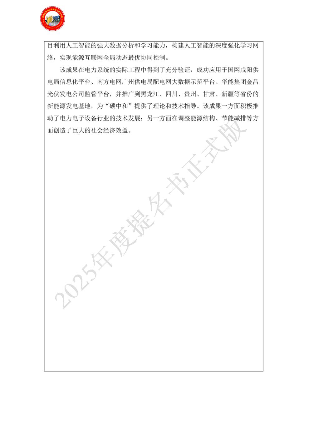 排名:3 行政职务:无 技术职称:教授 工作单位:西安交通大学 对本项目技术创造性贡献:项目主要完成人,在本项目中参与完成了分布式能源功率寻优和智能体协同控制方法的创新,合作完成了部分项目成果的工程应用,作为第二完成单位西安交通大学负责人对创新点二、三做出了重要贡献、投入工作量占本人工作量的50%以上。主要贡献为: