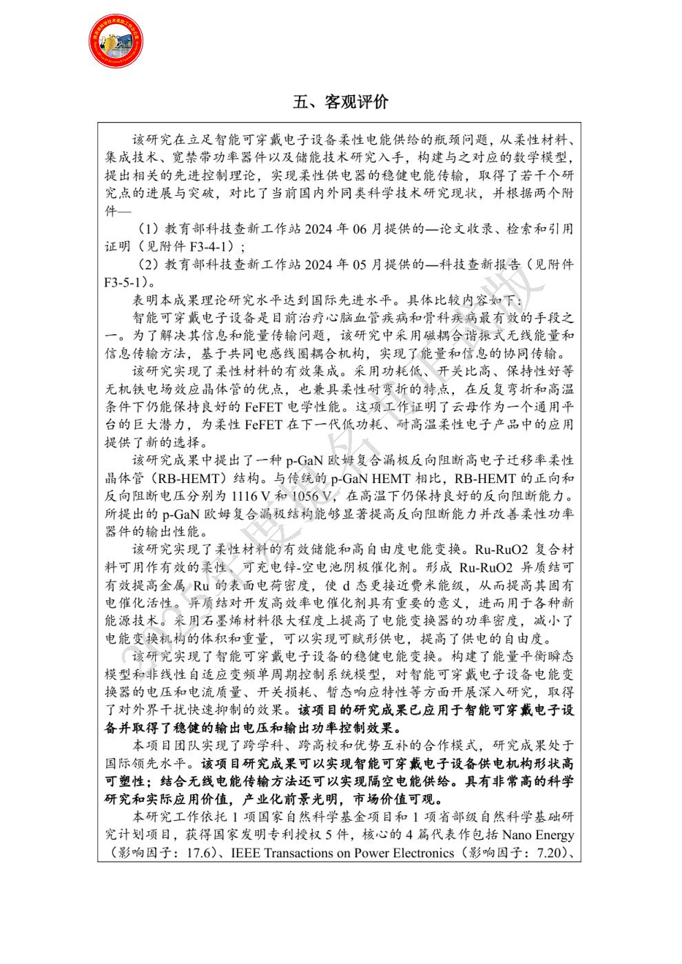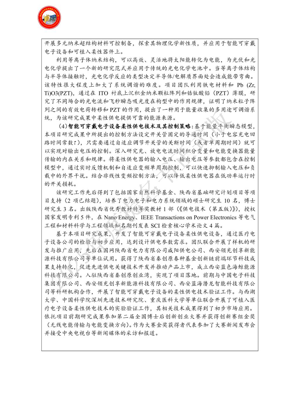 | 提名单位意见: | 柔性器件及供电技术与应用隶属于电气工程、控制科学与工程、计算机科学与技术、生物医学工程等学科的交叉领域,立足智能可穿戴电子设备柔性电能供给的瓶颈问题,从柔性材料、集成技术以及储能技术研究入手,构建与之对应的数学模型,提出相关的先进控制理论,实现了稳健的电能变换与传输。该研究工作先后得到了国家自然科学基金项目和省部级自然科学基础研究计划项目的持续资助。该项目成果中所开发的智能可穿戴电子设备柔性供电技术相关产品获得陕西省秦创原春种基金资助,项目落地陕西省秦创原(咸阳)创业湾,获得企业实际推广应用。该成果面向生物医疗和智能可穿戴设备的重大战略需求,具有前瞻性,研究起点高、理论创新性强,获得了国内外同行的广泛认同与肯定,在柔性器件及供电技术与应用研究方面起到了引领与示示范作用。依托该项目出版陕西省优秀教材特等奖教材1部(《供电技术(第五版)》),授权国家发明专利5件,发表高水平SCI期刊论文4篇。培养了电力电子和电力系统领域的硕士研究生10名,博士研究生3名。我单位认真审阅了该推荐材料及完成人资格,项目申报材料真实完整、齐全规范,无知识产权纠纷,项目完成单位人员排序无异议,符合陕西省科学技术进步奖提名条件。