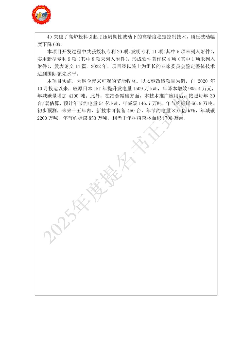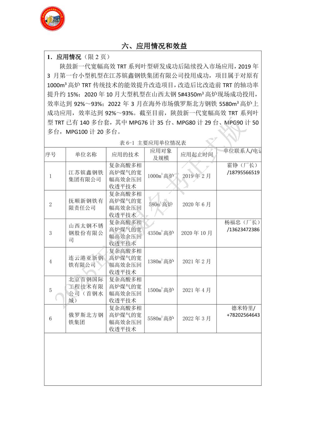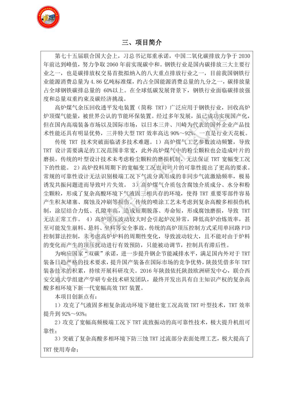 | 提名单位意见: | 高炉煤气余压能量回收透平装置(TRT)是高炉冶炼流程中能量回收的关键核心设备。经过多年发展,虽已成功实现初步国产化,但在国内特大型高炉高端装备市场以及国际市场,以日本三井、川崎为代表的国外企业产品在技术性能上仍然保持明显优势,其长期占据行业领先地位。这在一定程度上制约了我国大型装备的进一步国产化进程,同时也对中国大型设备在国际市场上的竞争力形成了较大压力。