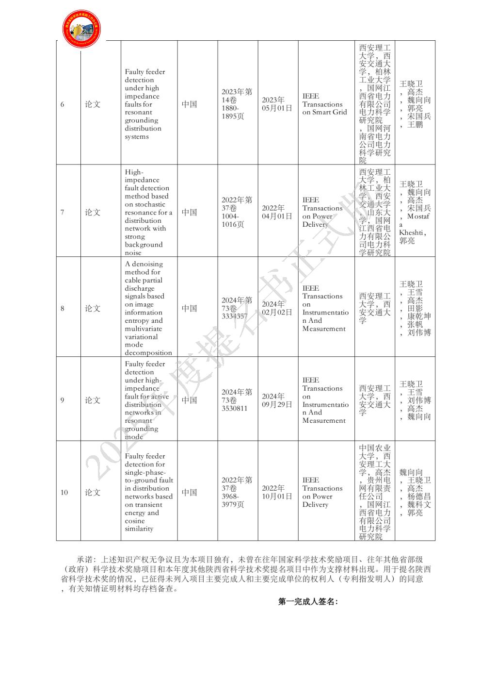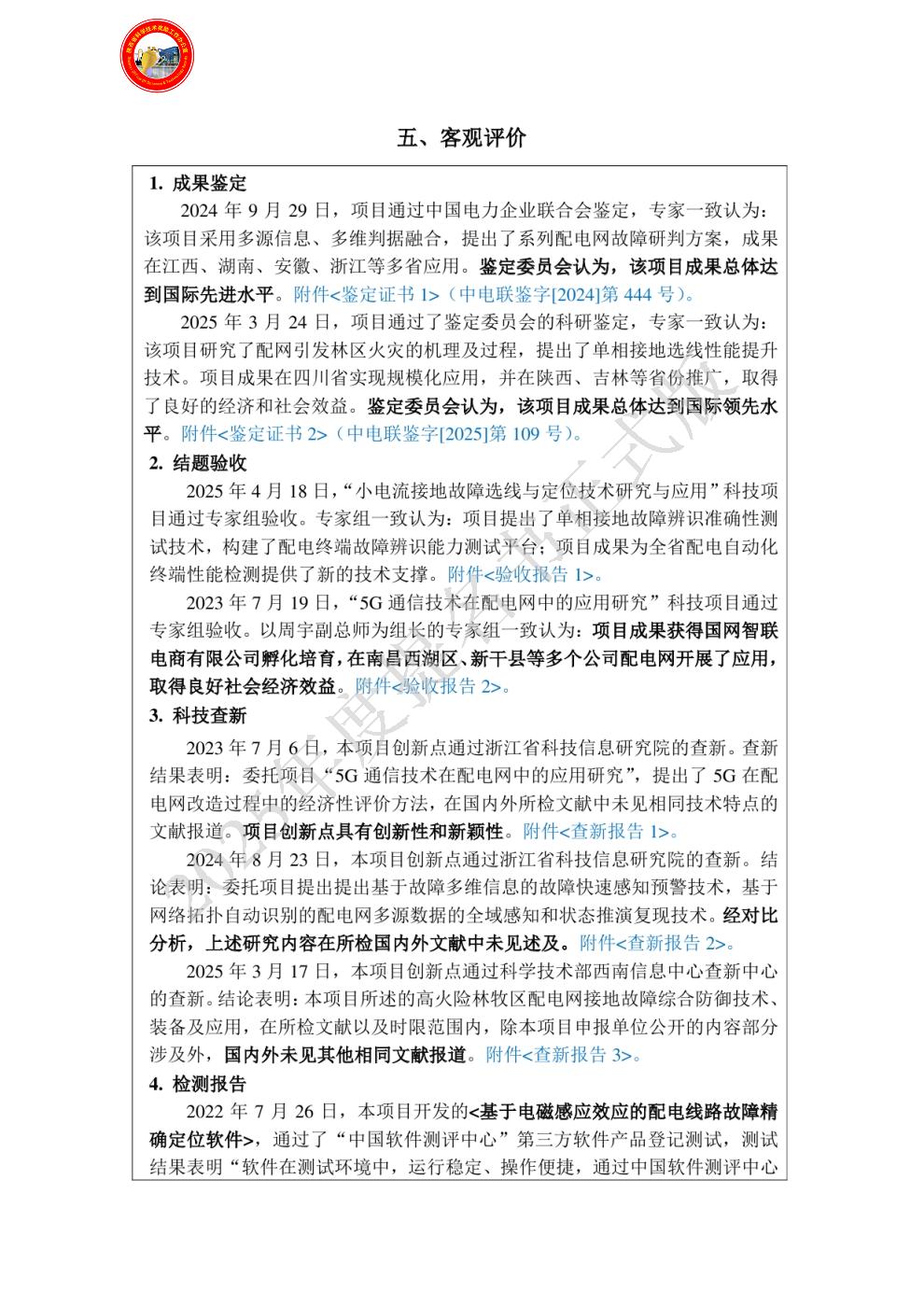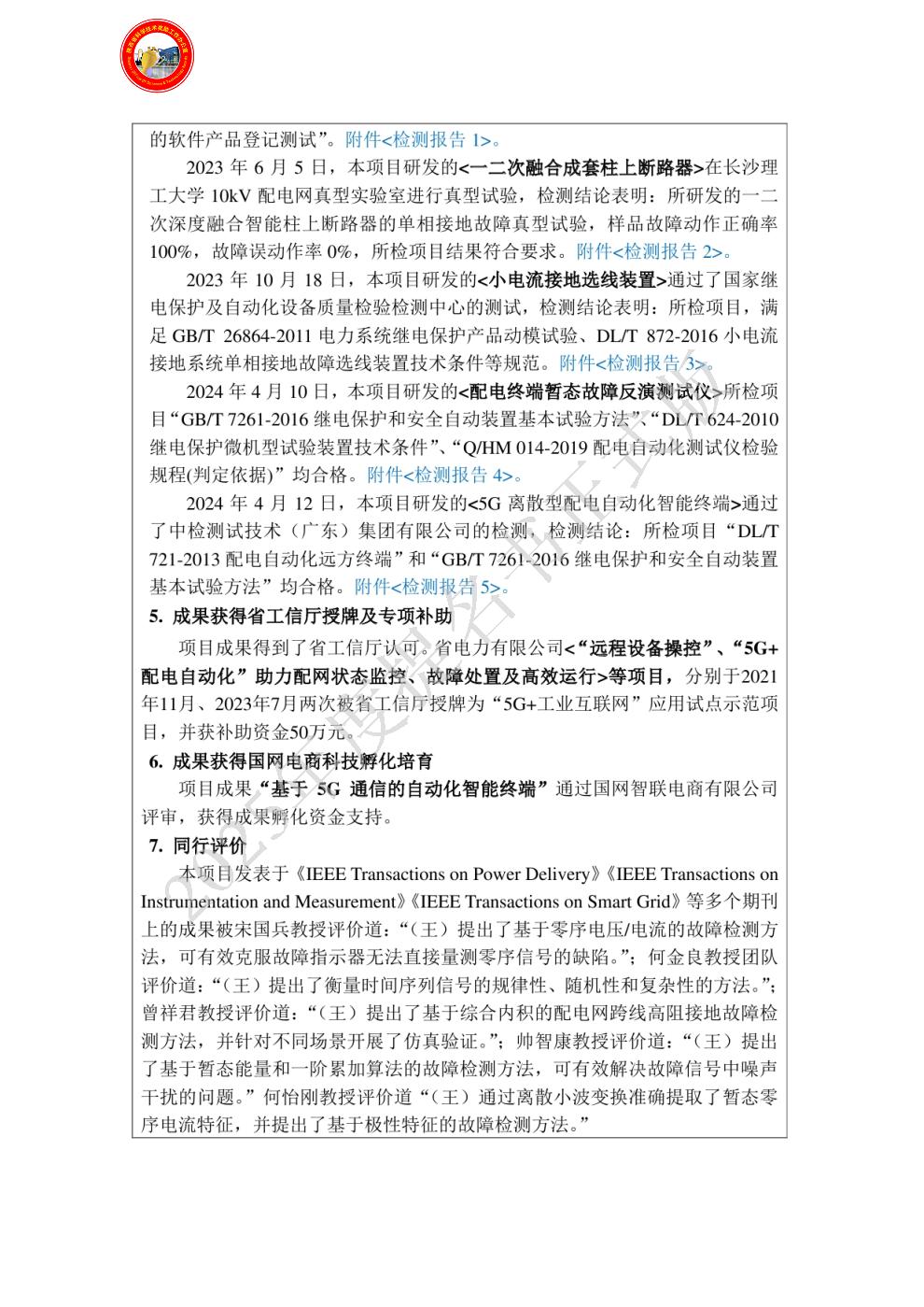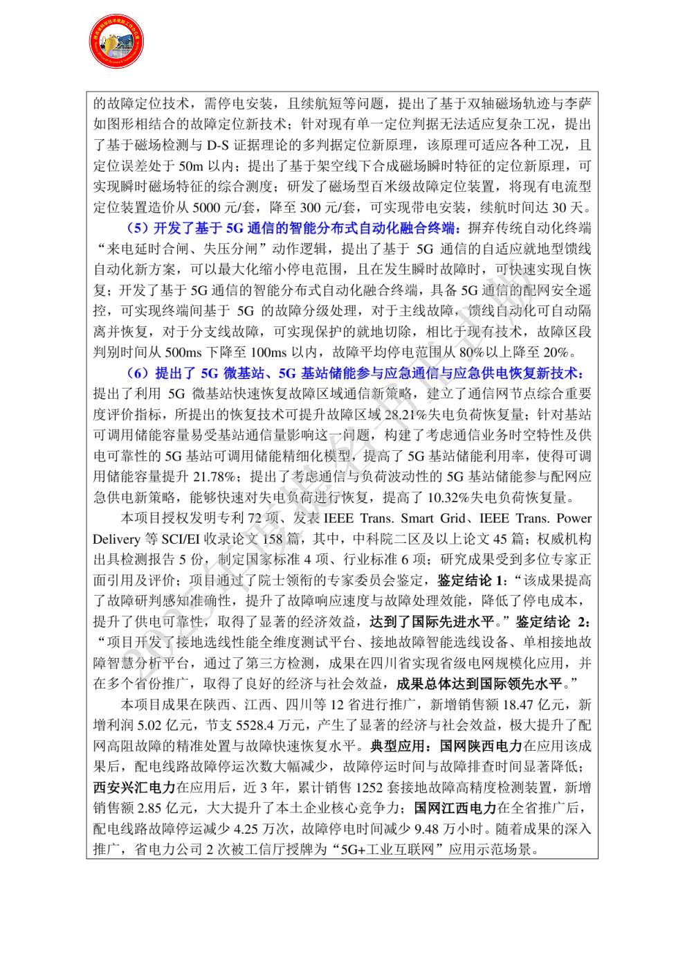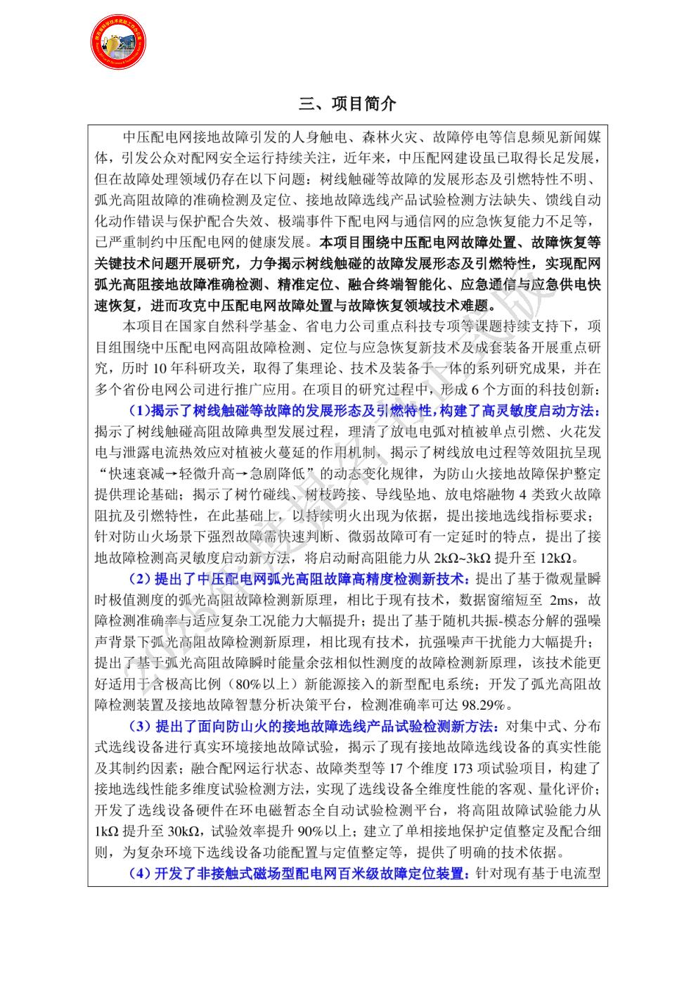 | 提名单位意见: | 该项目围绕中压配电网故障处置、故障恢复等关键技术问题开展研究,实现配网弧光接地故障准确检测、精准定位、融合终端智能化、应急通信与应急供电快速恢复,系统解决了中压配电系统故障处置与故障恢复领域的研究难题,取得了集理论、技术及装备于一体的系列研究成果,难度大,创新性强。该项目受到国家自然科学基金、省电力公司重点科技专项等课题的持续支持。研究成果受到多位知名专家的正面引用及评价;鉴定委员会认为:“项目开发了接地选线性能全维度测试平台、接地故障智能选线设备、单相接地故障智慧分析平台,通过了第三方检测,成果在四川省实现省级电网规模化应用,并在多个省份推广,取得了良好的经济与社会效益,成果总体达到国际领先水平。”项目成果在陕西、江西、四川、河南等省进行推广,产生了显著的经济效益,极大提升了配电网故障的智能化处置水平。该项目申报材料属实,主要完成人、完成单位资格及排序已通过审查,同意推荐2025年陕西省科技进步奖。 |