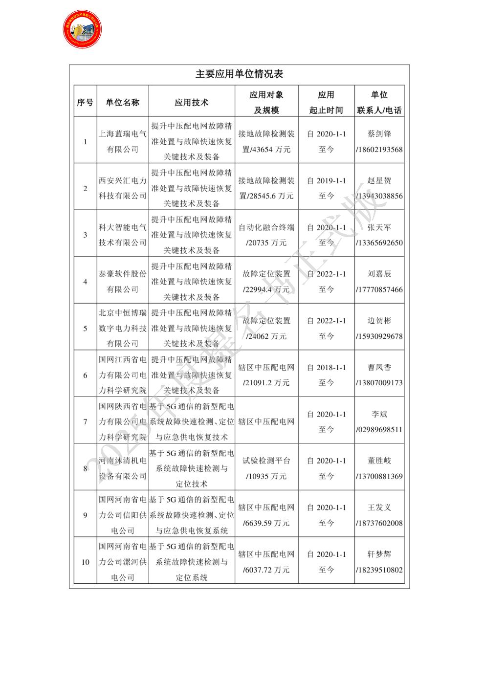 单位贡献: 本单位在主要科技创新1、2、3、4、6均有创造性贡献:(1)提出了基于微观量瞬时极值测度的弧光高阻故障检测原理,提出了基于随机共振-模态分解的强噪声背景下弧光高阻故障检测原理,提出了基于弧光高阻故障瞬时能量余弦相似性测度的故障检测原理。(2)开发了5G通信的磁场型配电网百米级故障定位装置,可实现带电安装,定位误差在50m以内。(3)提出将故障区域通信状态变化作为状态变量纳入负荷转供与孤岛形成应急措施中,分析通信状态对联络开关及分布式电源出力控制的影响,实现了对通信状态影响的定量分析。(4)构建了通信容量因子量化通信时空特性,利用加权平均节点度对传统基尼系数进行修正,利用通信容量因子与供电可靠性指标,改进传统基站可调用储能模型,从而提高了5G基站储能利用率。