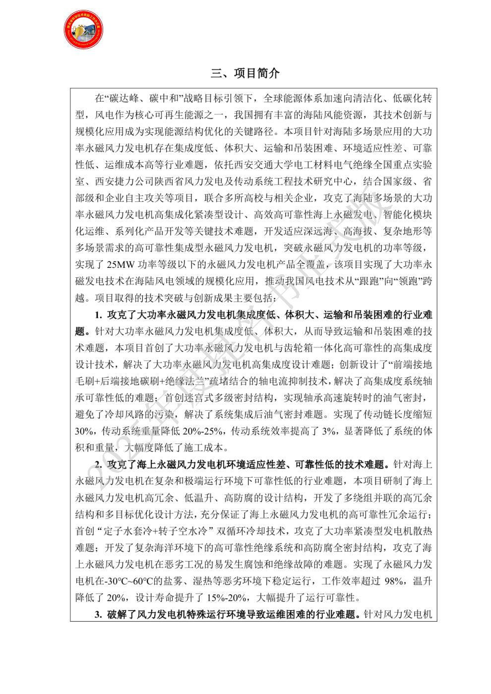 该项目选题准确,技术创新突出,对我国海陆多场景应用的大功率永磁风力发电机的技术进步与产业结构优化升级起到了重大推动作用,积极响应国家“双碳”战略,对改善大气环境贡献显著,应用前景广阔,具有重要的推广价值,符合陕西省科学技术进步奖二等奖的提名条件。