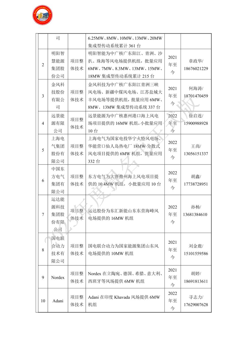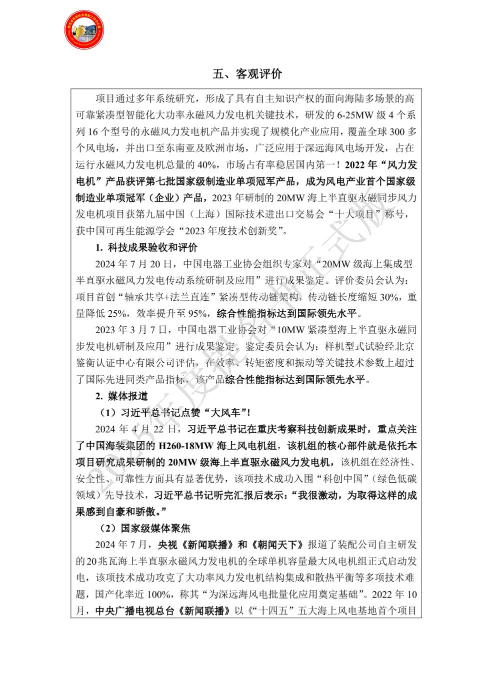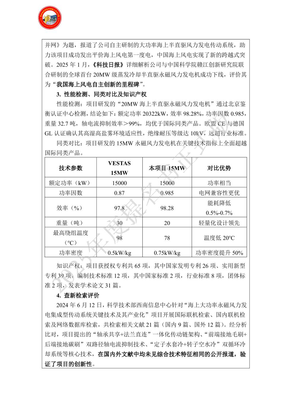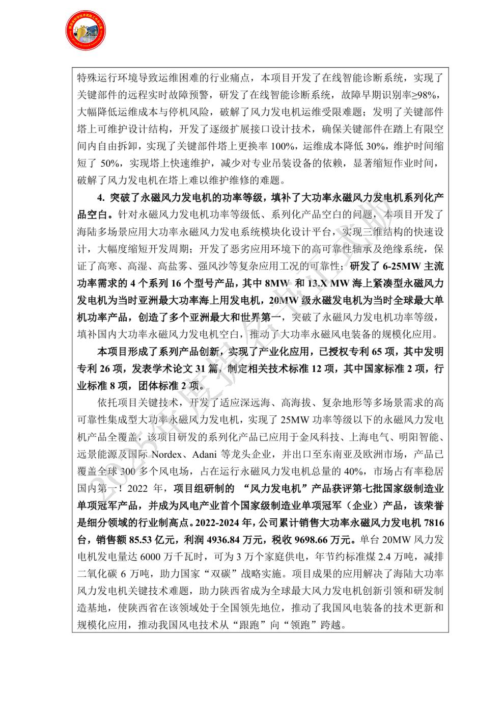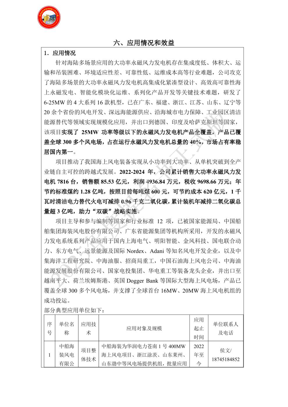 具体贡献如下:1.主导大功率永磁风力发电机的技术创新。公司具备永磁风力发电机相关的研发人才100余人,由公司牵头,结合多家合作单位,攻克了大功率永磁风力发电机的技术难题,并加工制造样机,进行测试、研制与持续改进。2.主导开发了6-25MW永磁风力发电机的技术创新与产品研发,实现25MW以下功率风电产品的全覆盖,截止2024年底,公司已累计为中国风电市场提供各类型风力发电机53000余台,产品分布全国2100余个风电场,市场占有率国内第一,推动了永磁风力发电机的大规模应用。3. 获批专利40项,国家和行业相关标准12项,发表论文11篇。