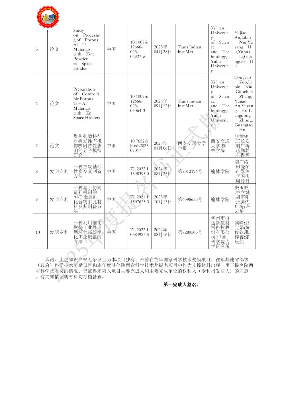排名:3 行政职务:无 技术职称:副教授 工作单位:西安科技大学 对本项目技术创造性贡献:(1)研发了一种低成本的耐高温、抗腐蚀的 Al-Ti 金属间化合物多孔材料;