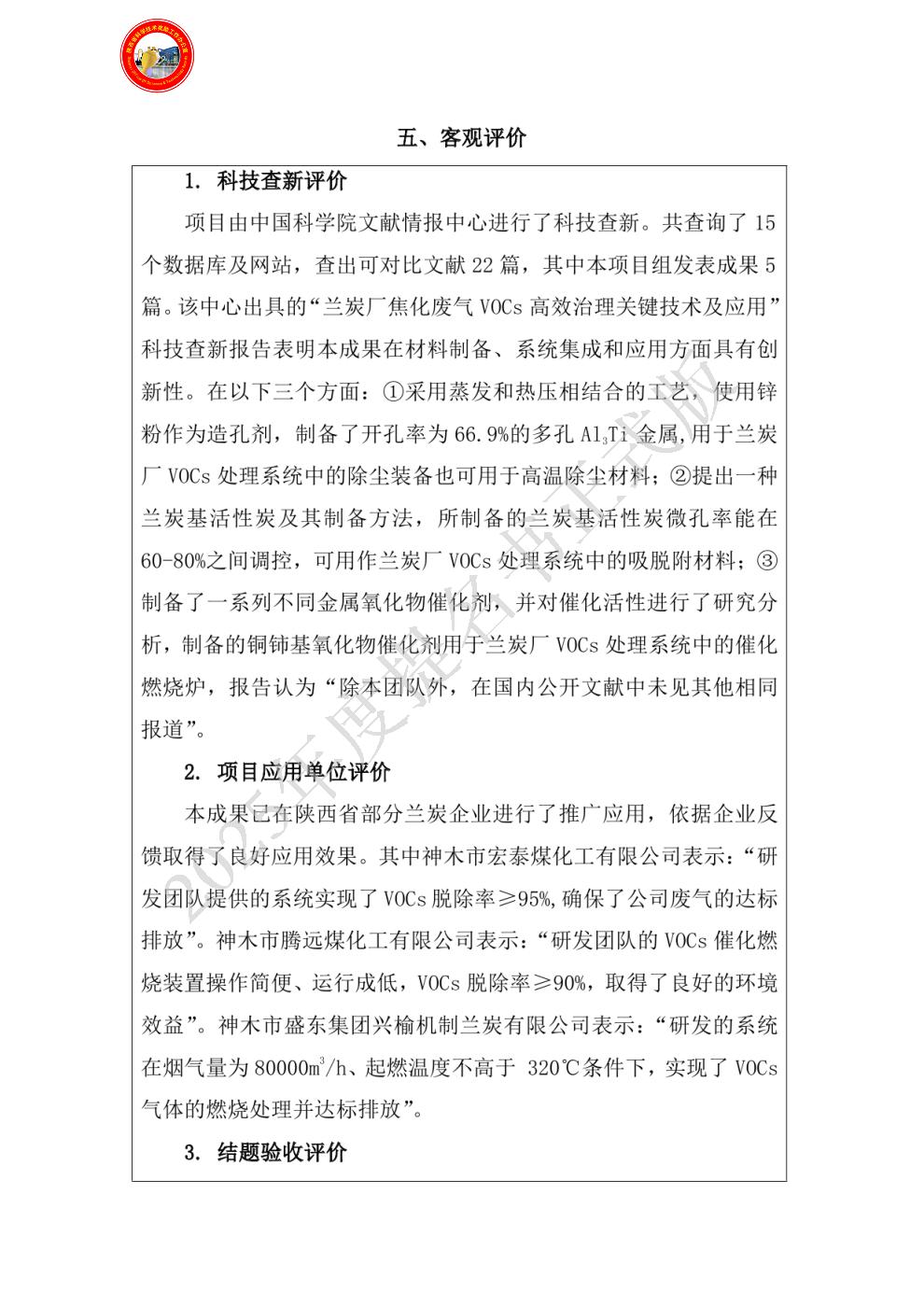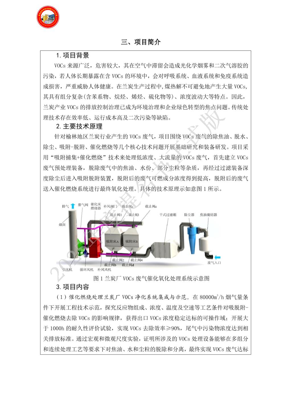 (1)提出用“吸附捕集+催化燃烧”治理方法解决兰炭厂废气VOCs 气体治理;并对催化剂、吸脱附材料进行了研究,研发成果有发明专利和论文等;